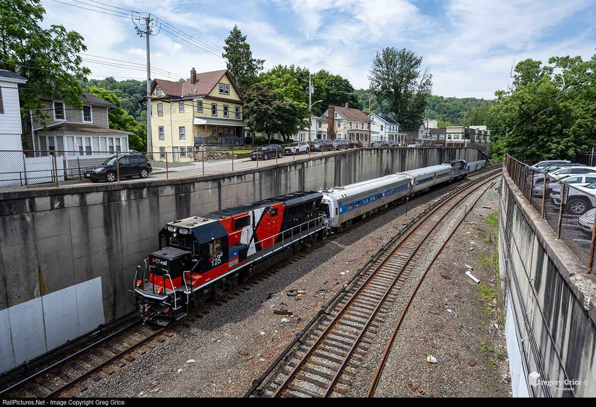 On the afternoon of July 2nd, 2025, the Metro North/ Department of Transportation Geometry Train, led by CTDOT/CTrail Brookville BL20GHM 125, traverses though the open cut at Pleasantville, New York on the Harlem Line. The train traversed all of Metro-North's mainline track while the Federal Railroad Administration’s (FRA) former Metroliner, DOTX 216 inspection car, collected geometry data for the FRA and the U.S. Department of Transportation.