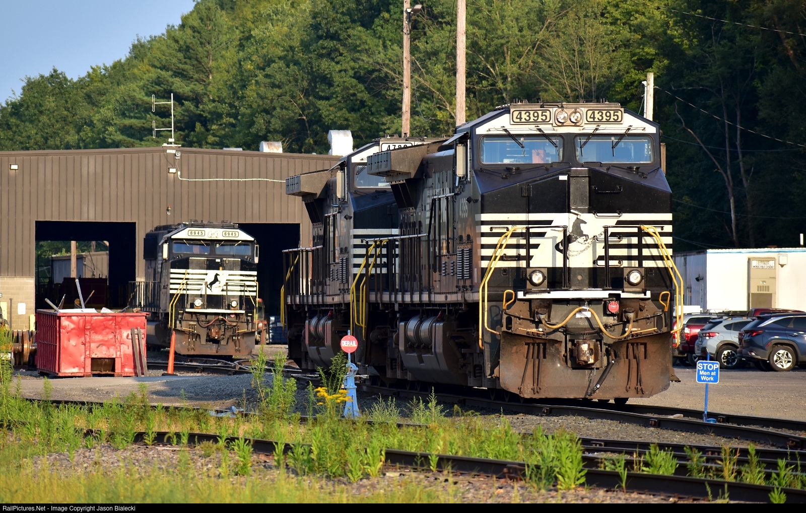 | Late in the day at the north end of Norfolk Southern's Binghamton Yard a trio of locomotives (4395, 4782 and 6945) rest out in front of the engine house. |