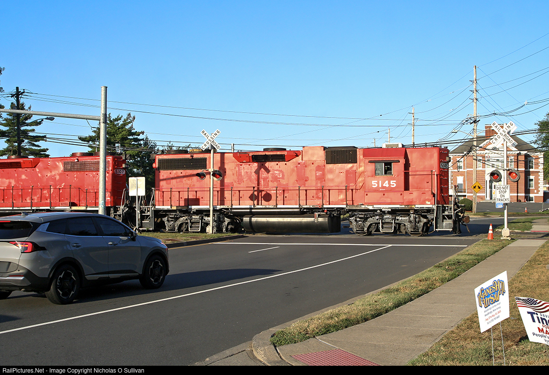 | Raritan Central’s RC1 crosses Woodbridge Avenue on its way back from Metuchen Yard. The other engine is RCRY 5107. Both engines formerly were engines for the Southern as SOU 5145 and SOU 5107, respectively, before going to Norfolk Southern as NS 5145 and NS 5107. They were sold to Larry’s Truck Electric (LTEX) in 2017 as LTEX 5145 and LTEX 5107 and purchased by the Raritan Central Railway in 2021. |
