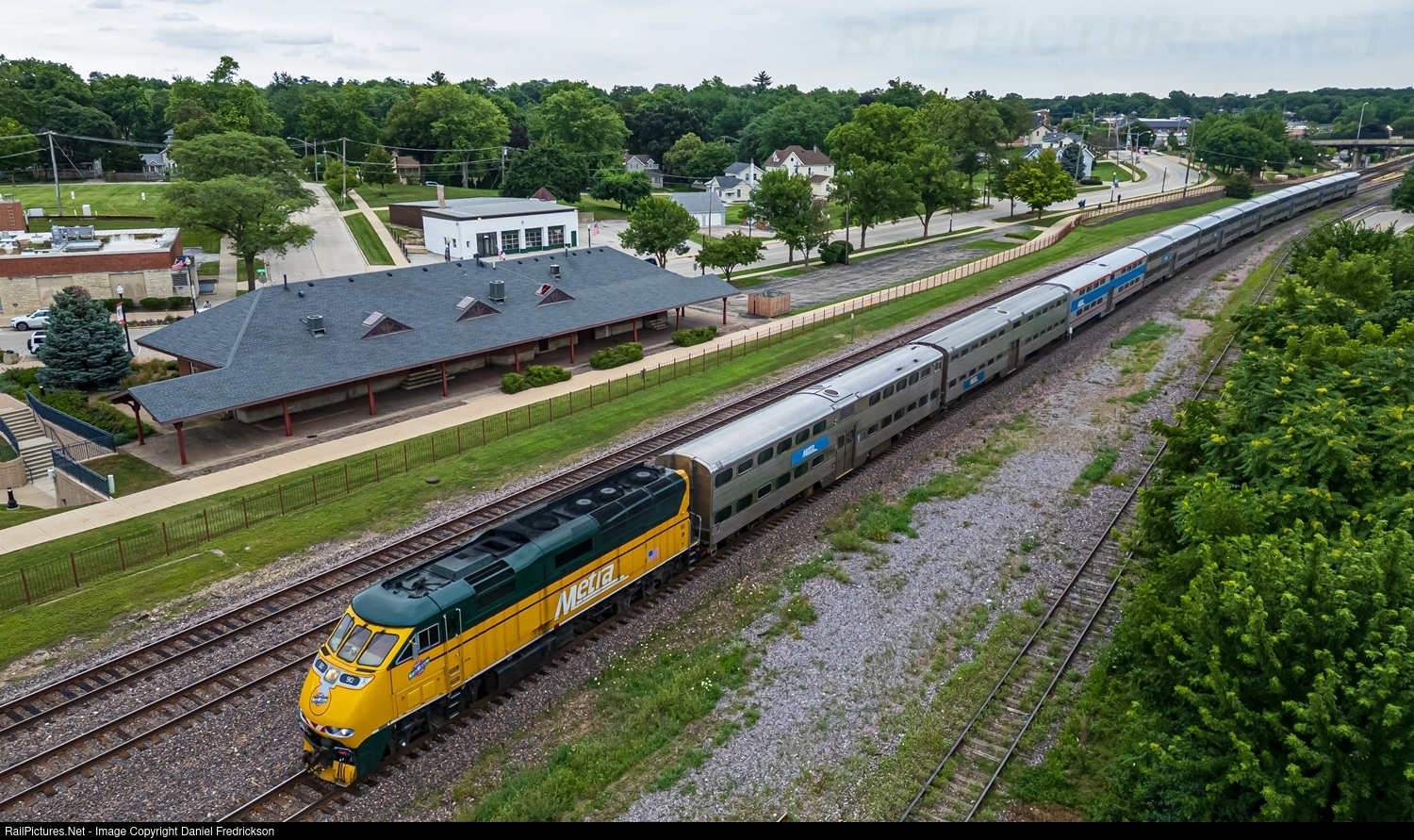 METX 90, Metra's Chicago & Northwestern F59PHI, makes an appearance in West Chicago, IL with a UP-W train that has just finished its scheduled stop. In the background is the Western DuPage Chamber of Commerce, a former C&NW depot constructed in 1912 to replace the previous 1869 depot that became a freight house.