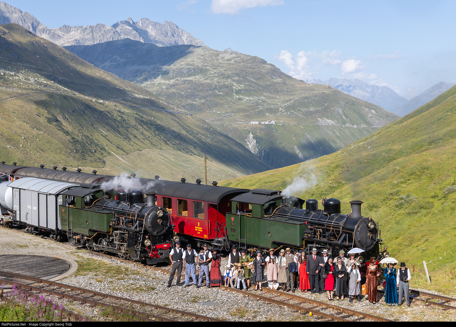 After a long day in beautiful weather on the Furka Mountain Steam Railway (Dampfbahn Furka Bergstrecke, DFB) on the eastern side of the Furka Pass, around 25 passengers and staff of the P.M. photo event gather in front of the two HG 4/4 # 704 and # 708 cogwheel steam locomotives in Furka DFB. This is the first time that both locomotives can be seen here at 2,160 meters above sea level with trains. As is well known, both engines were built in 1923 and 1930 by SLM Winterthur for French Indochina, now Vietnam, and never ran on the Furka line. They were transported to Switzerland in 1990, more or less as scrap, and since this summer, both locomotives have been beautifully restored and are back in service.