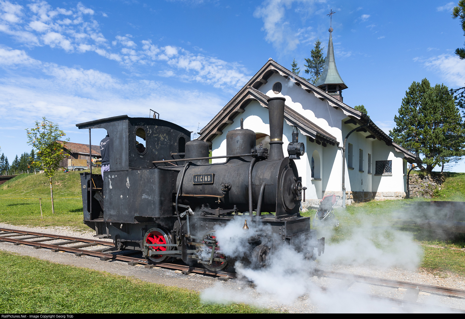 Temporary 1-meter gauge railway track approximately 100 meters long in Rigi Scheidegg, celebrating 150 years since the opening of the Rigi-Scheidegg Railway in 1875, with steam locomotive G 2/2 "Ticino" of Martin Horath. The Rigi Kaltbad-Scheidegg Railway (RSB), also known as the Rigi-Scheidegg Railway or Kaltbad-Scheidegg Railway for short, is a former Swiss narrow-gauge railroad. In Rigi Kaltbad at 1423 m above sea level, it connected to the Vitznau-Rigi Railway built in 1871 and ran to Rigi Scheidegg at 1648 m above sea level. When it was completed, it was the highest adhesion railroad in Europe. The 6.7-kilometre metre-gauge line was opened in July 1874 from Rigi Kaltbad to Rigi First and around a year later to Rigi Scheidegg. The railroad was never economically viable, the line was closed in 1931 and the track was finally demolished in 1942. To mark the 150th anniversary of the opening of the Rigi-Scheidegg Railway, a 100-metre-long track was laid at Rigi Scheidegg and steam operations were carried out on two weekends with Martin Horath's two-axle Ticino steam locomotive. The locomotive was built in 1889 by Arnold Jung in Jungenthal/Germany.