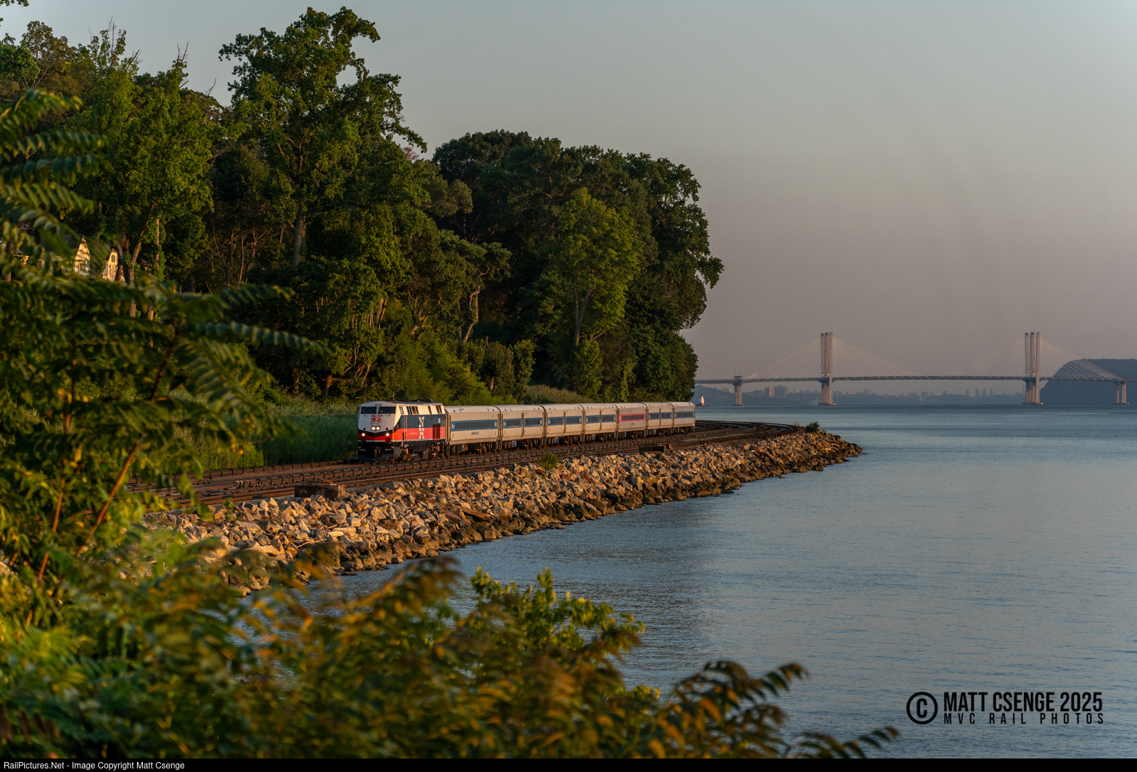 As the sun sinks low in the sky, Metro-North Railroad P32AC-DM no. 228 is seen powering Hudson Line train 8851 north along the namesake Hudson River. The Mario Cuomo Bridge (pronounced "Tappan Zee") reaches out across the river in the background, with the distant skyline of New York City jutting up beneath it. |