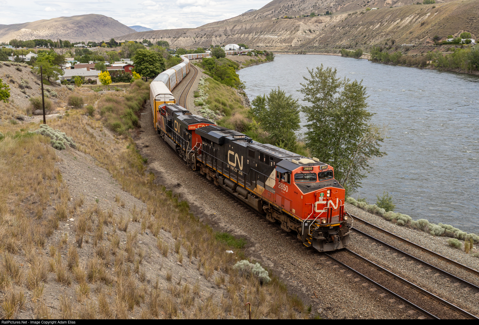 | A Westbound autorack curving its way into Ashcroft, BC, on the CN Transcon to Vancouver. This is beautiful territory. |