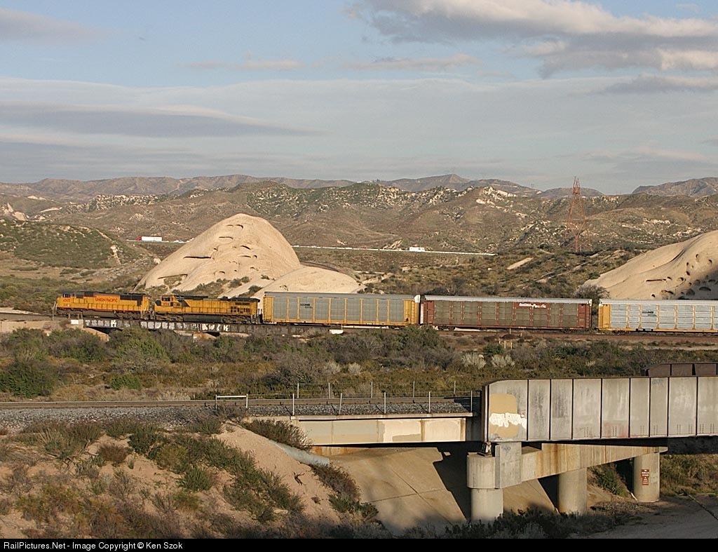 UP 4505 and UP 9798 cross the dry wash near Mormons Rocks as they lead an auto train up Cajon Pass.