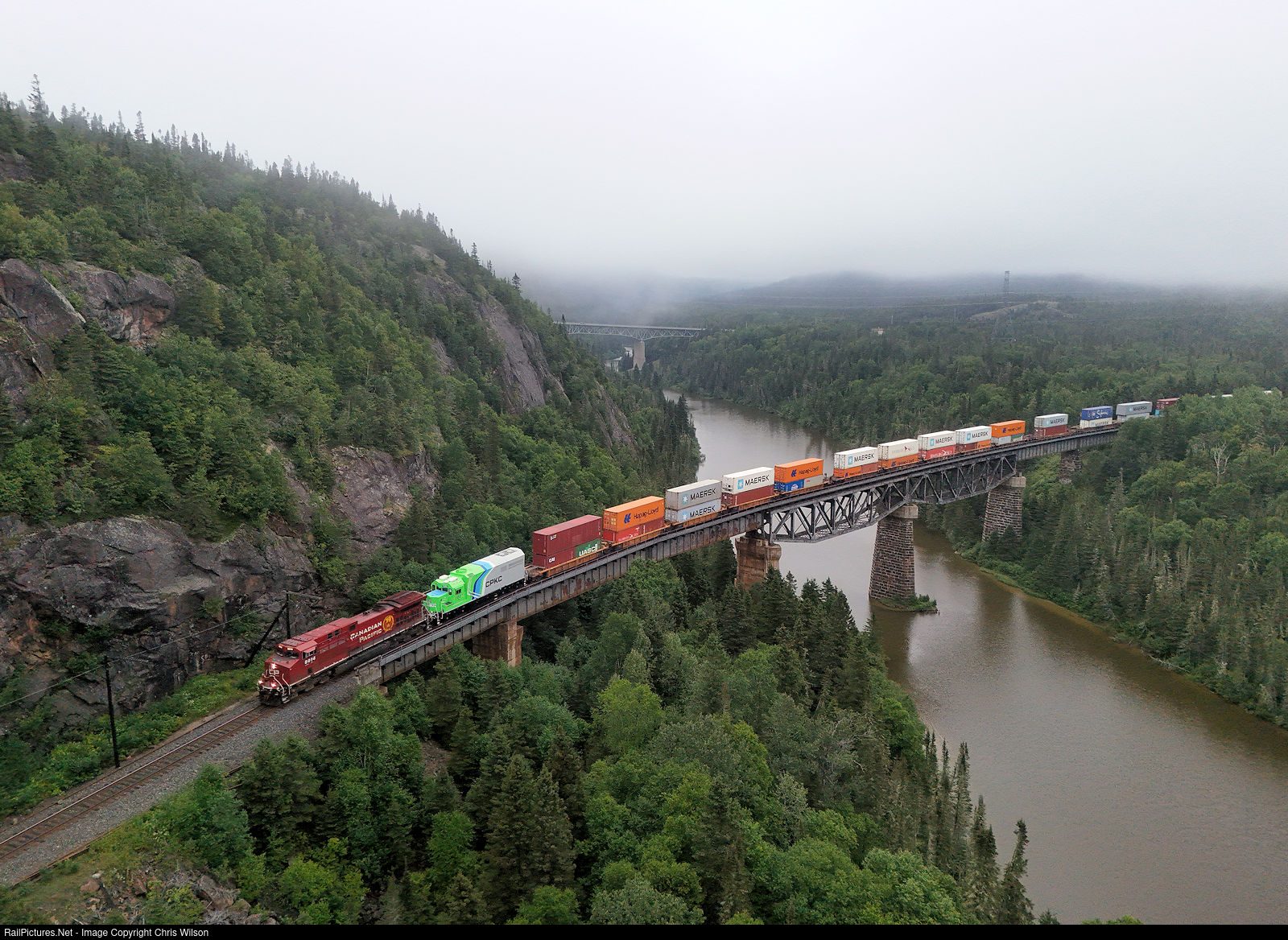 | Lingering multi day coastal fog off Lake Superior (its 1900!) greets CPKC Railway's Toronto, Ontario to Vancouver Deltaport, British Columbia stacks crossing over the Little Pic River. Trailing CP AC4400CWM 8014 is a CP GP38H 1100 a new hydrogen powered locomotive. |