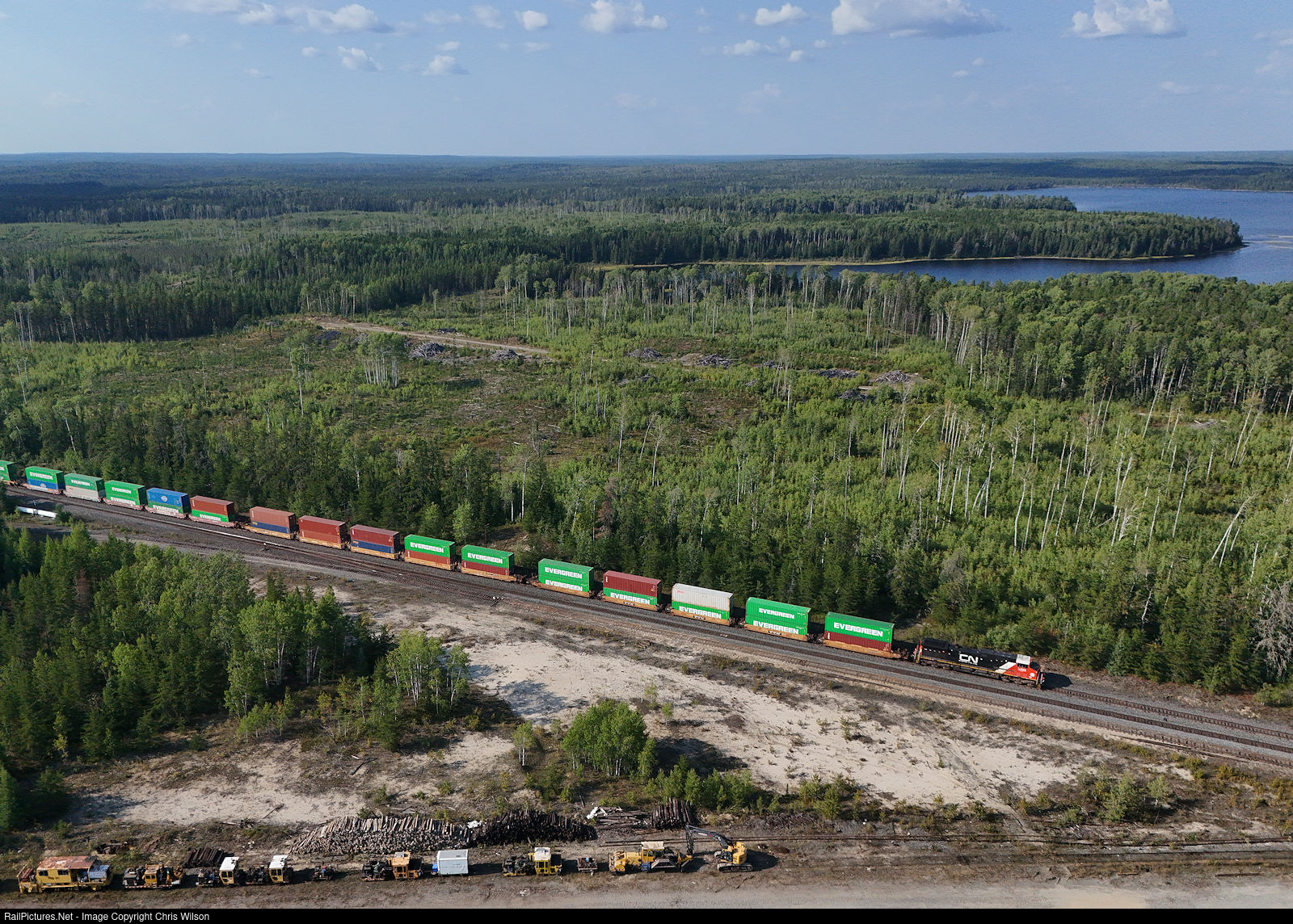 EVERGREEN! Intermodal traffic from the Port of Vancouver, BC originating at Thornton Yard head east for CN's Brampton Intermodal Terminal north of Toronto. White Otter Lake is off in the distance and the fast boreal forest. The tie gang/rail gang equipment sitting in the foreground has finished for the season on the Caramat Sub and is waiting to be floated to the next job.