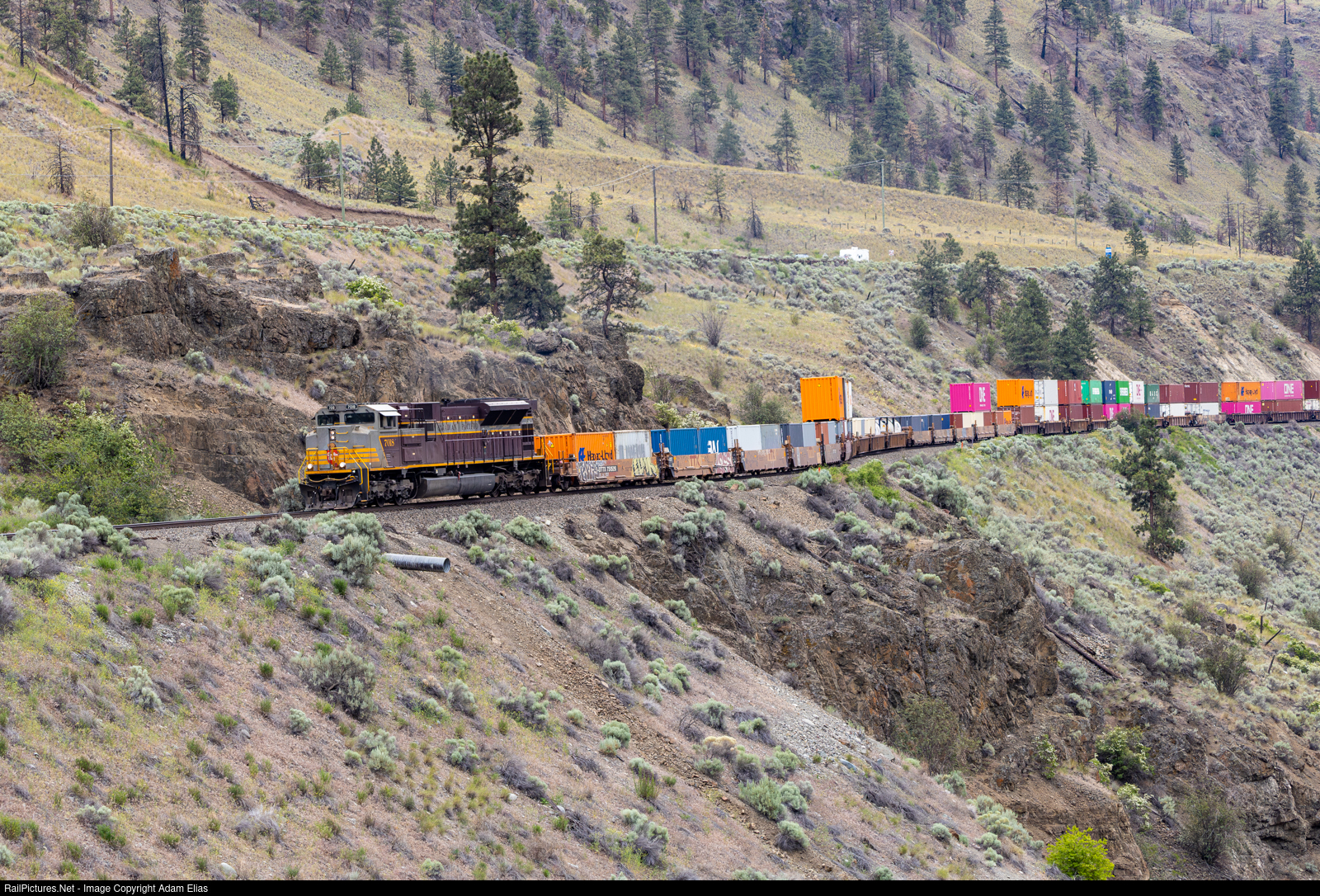| CP 7018 curving through the Thompson Canyon alongside the Thompson River on the CPKC Thompson Subdivision. This ACU was a huge score on my one day I got to spend rail fanning here. This is an area I've wanted to hit for awhile. |