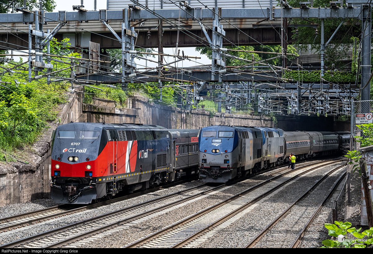 On July 7th, 2025, westbound CTrail train 4403, led by CTDX GE P40BH 6707, passes the Amtrak Switching crew, with 2 GE P42DCs, as they couple to the rear of disabled Northeast Regional Train 170(7) at the Dead Section just west of Mill River Interlocking on the Shore Line section of Amtrak’s Northeast Corridor in New Haven, Connecticut.
