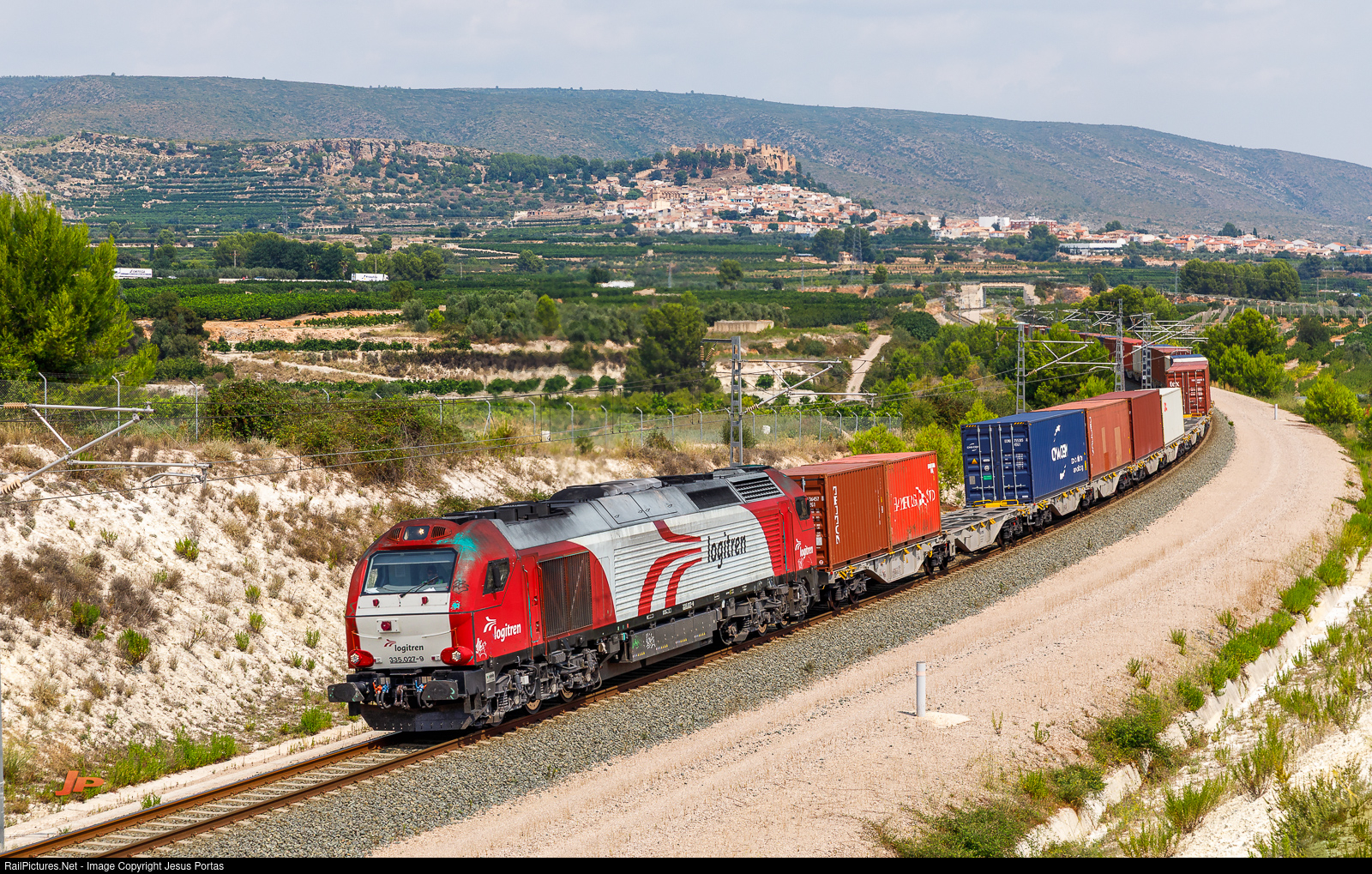 Intermodal pulled by Logitren (Alpha Trains) 335.027-9 bound for Madrid. Montesa's castle is seen in the background.