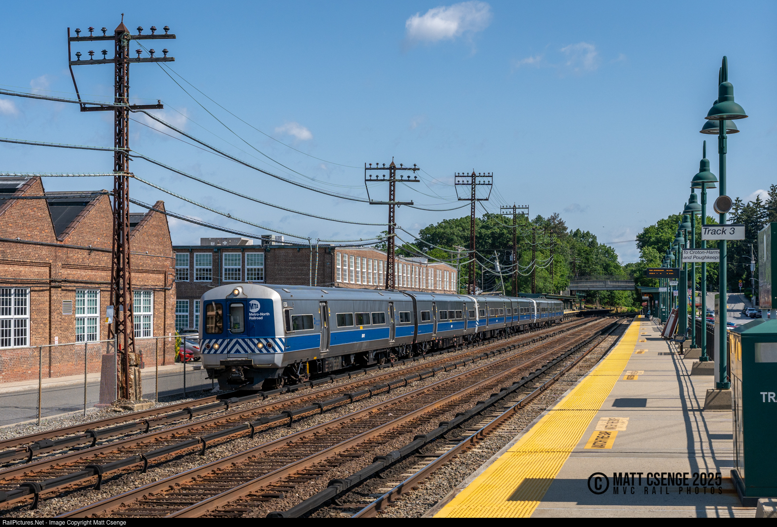 Metro-North Railroad M3A no. 8041 is the lead unit on Hudson Line train 4744, seen departing Irvington Station. The M3A cars were built by Budd starting in 1984, and are nearing the end of their service lives after more than 40 years of operation. Their numbers have dwindled enough that they are only seen in revenue service on weekdays, when peak demand cannot be met with other car classes alone. |