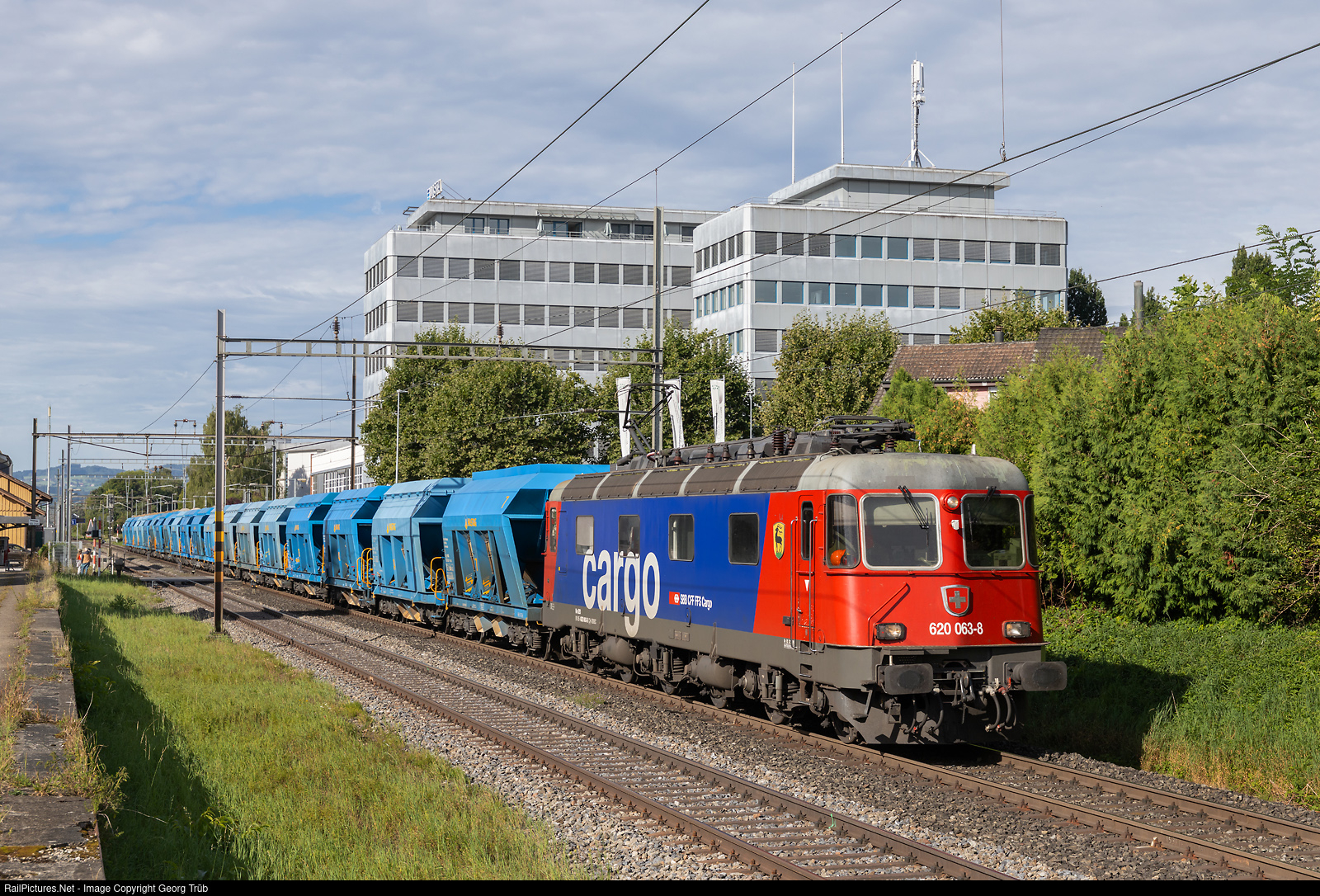 | Re 620 # 063 (Re 6/6 # 11663) of the SBB with name and blazon of Eglisau hauls the loaded HASTAG gravel train 67871 from Hüntwangen via Bülach-Winterthur-Romanshorn VL to Rorschach freight yard through Erlen. From Rorschach, the train will go to the MOAG (Mischgutwerke Ost AG) near Goldach for concrete production, in two parts due to the load. |