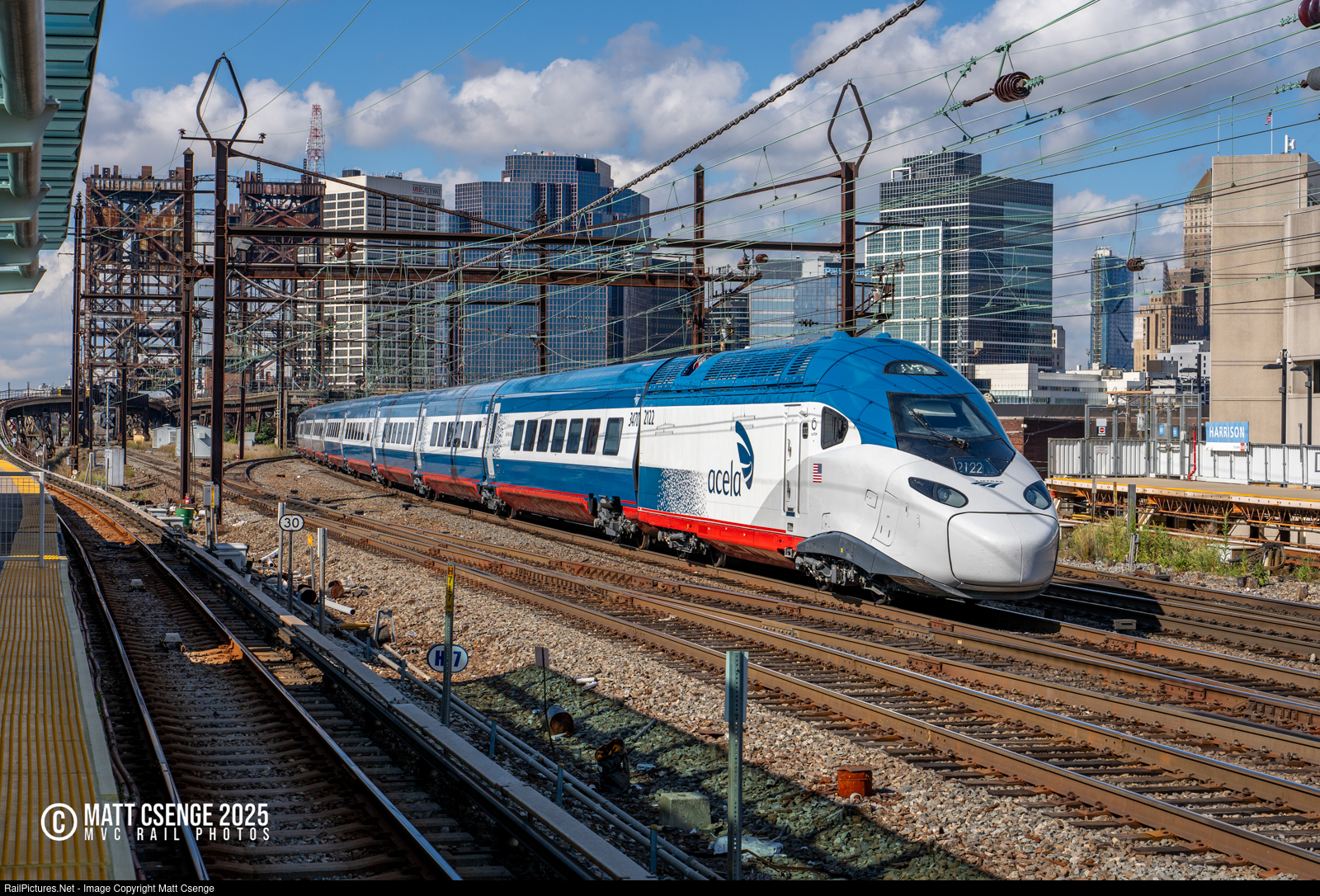 Amtrak Avelia Liberty power car 2122 is the lead unit on Acela train 2154, seen passing through Harrison Station shortly after departing Newark Penn Station. As with any new equipment, the new trainsets have had some teething issues now that they have entered revenue service, but the railroad and the manufacturer are working hard to resolve these issues and more will begin displacing the old fleet in the near future. |