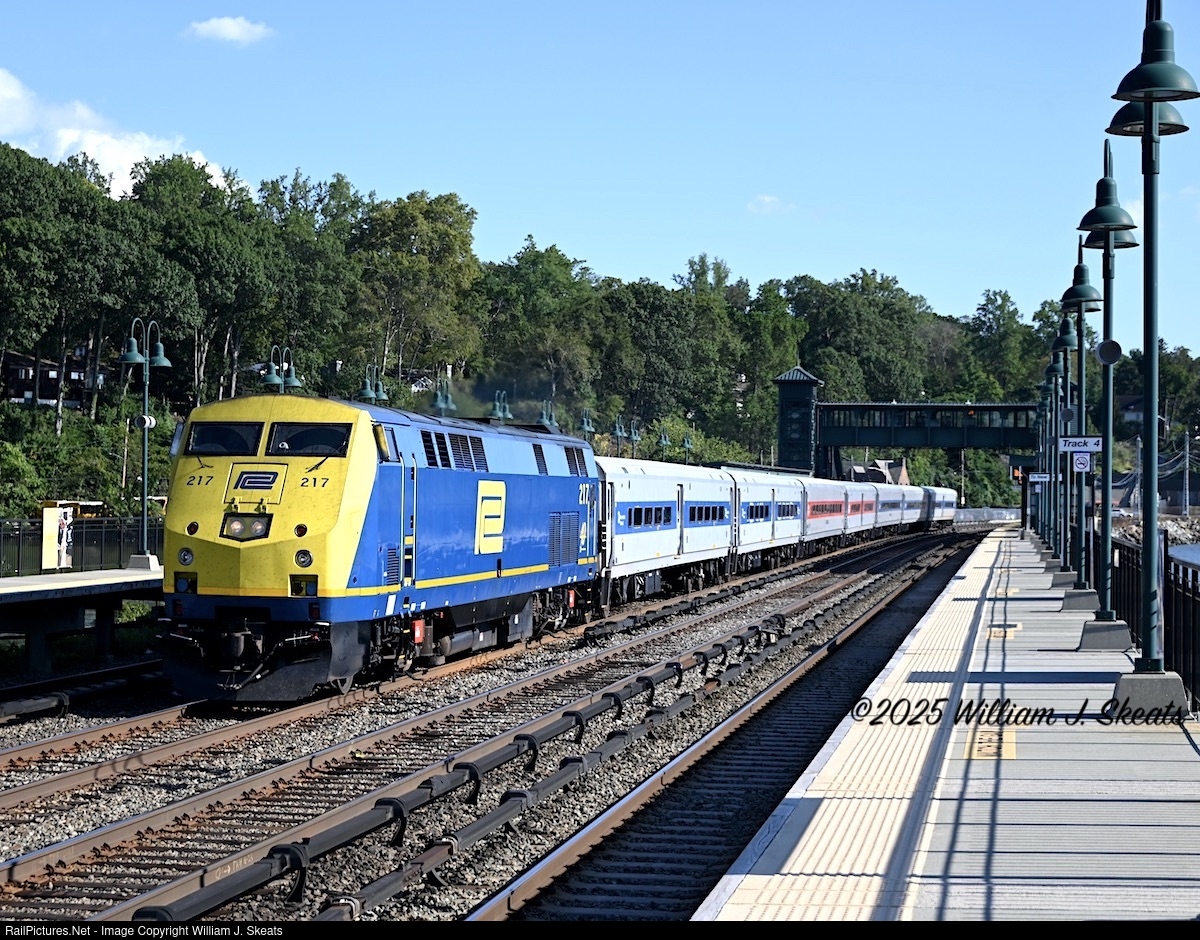 | Penn Central Heritage P32AC 217 and seven cars heading around the curve at Scarborough. Siemens Charger locomotive will be put in service this month so go out get some pictures before these are retired. |
