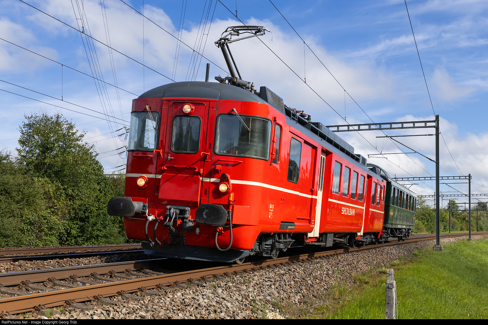 | Passenger railcar BDe 4/4 # 92 of the Zürcher Museumsbahn (ZMB), former Sihltalbahn, pulls the dynamometer car Xd4ü # 99701 as train 31478 (Rail Historic) from Winterthur via Wallisellen-Zürich track 31/32-Zürich Wiedikon-Giesshübel-Adliswil-Sihlbrugg-Zug to Cham, between Winterthur and Winterthur Tössmühle. The railcar was built in 1968 by SWS and BBC. |