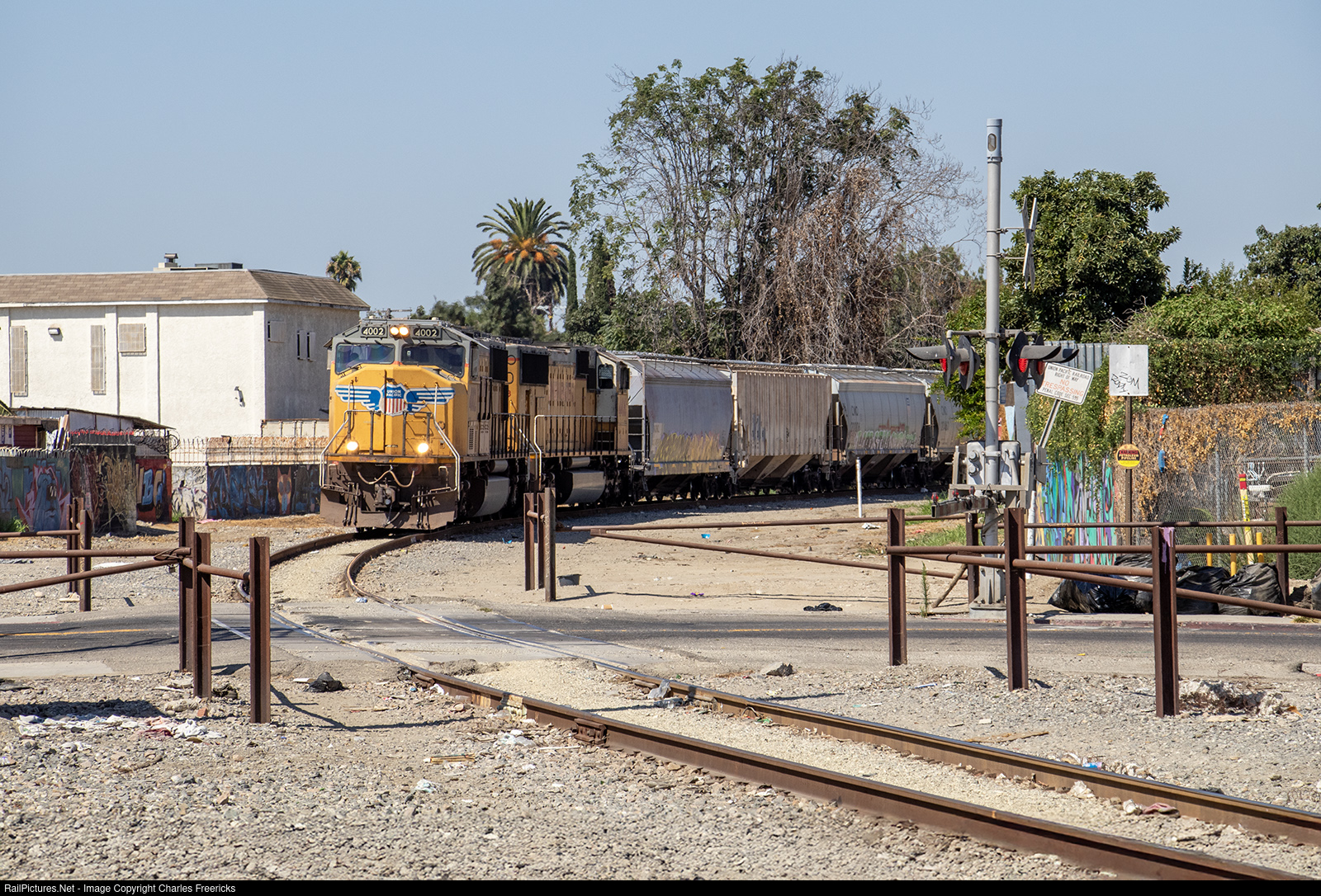 | The Union Pacific LOW10 El Segundo Local enters the curve at Compton Avenue (between Centralia and Watts) as it prepares to enter the Wilmington Sub (the one time four-track Pacific Electric main). |