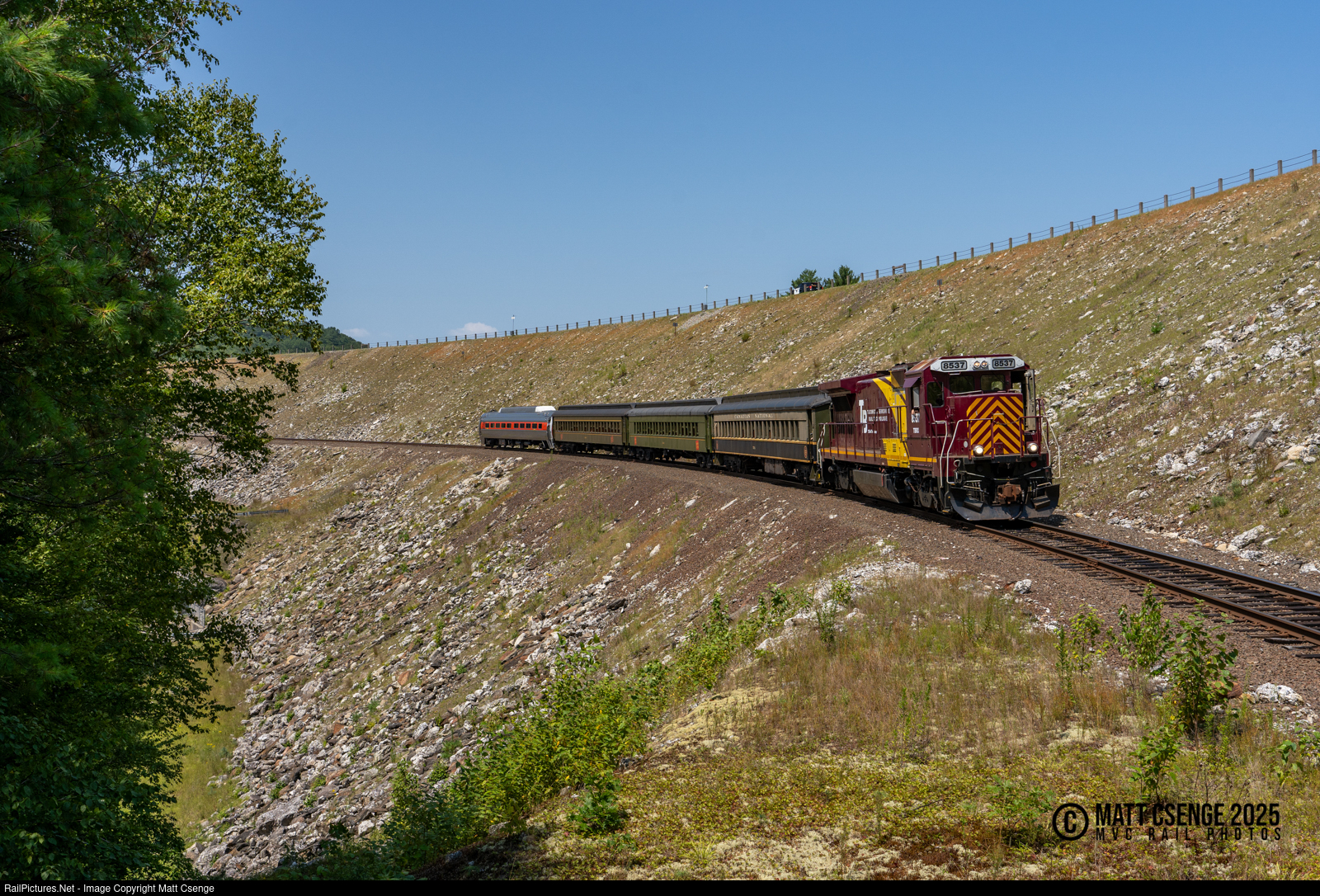 The Naugatuck Railroad excursion train is seen descending back to Thomaston with B39-8E locomotive TBRX 8537 in the lead. The locomotive is a leaser from Taconic and Berkshire Rail Technology, subbing for the railroad's usual EMD power on this particular day. |