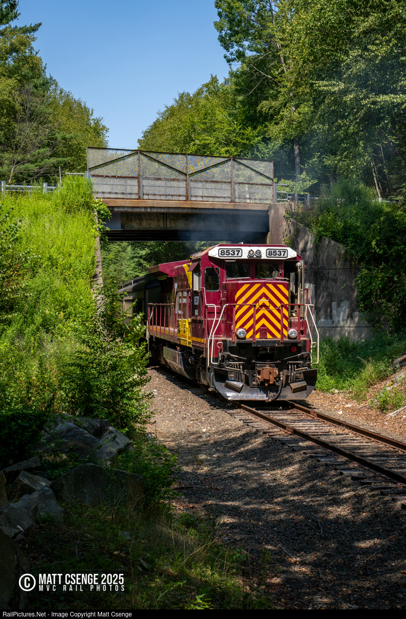 The Naugatuck Railroad excursion train is seen passing under Hill Rd with B39-8E locomotive TBRX 8537 in the lead. The locomotive is a leaser from Taconic and Berkshire Rail Technology, subbing for the railroad's usual EMD power on this particular day. |