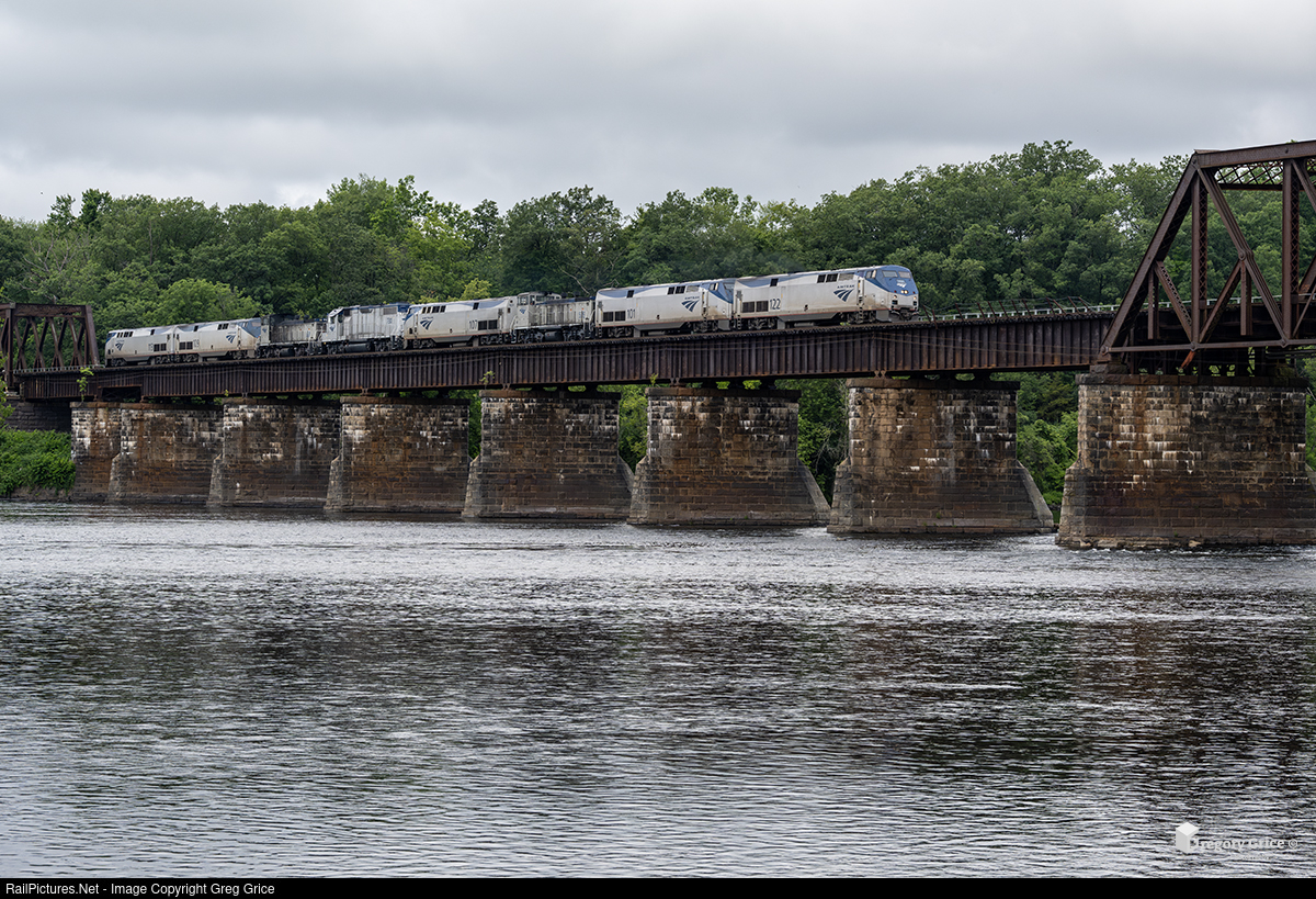 On July 9th, 2025, Amtrak Extra 864, consisting of eight Amtrak diesel locomotives (P42DC #122, P42DC #101, MP15DC #539, P42DC #107, GP38-3 #730, MP15DC #537, P42DC #109 and P42DC #113), crosses the Connecticut River on the Warehouse Point (Connecticut River) Railroad Bridge in Windsor Locks, Connecticut on the MRS (Hartford) Line. The equipment move was on its way to the railroad's Rensselaer shops in New York for various levels of repairs.