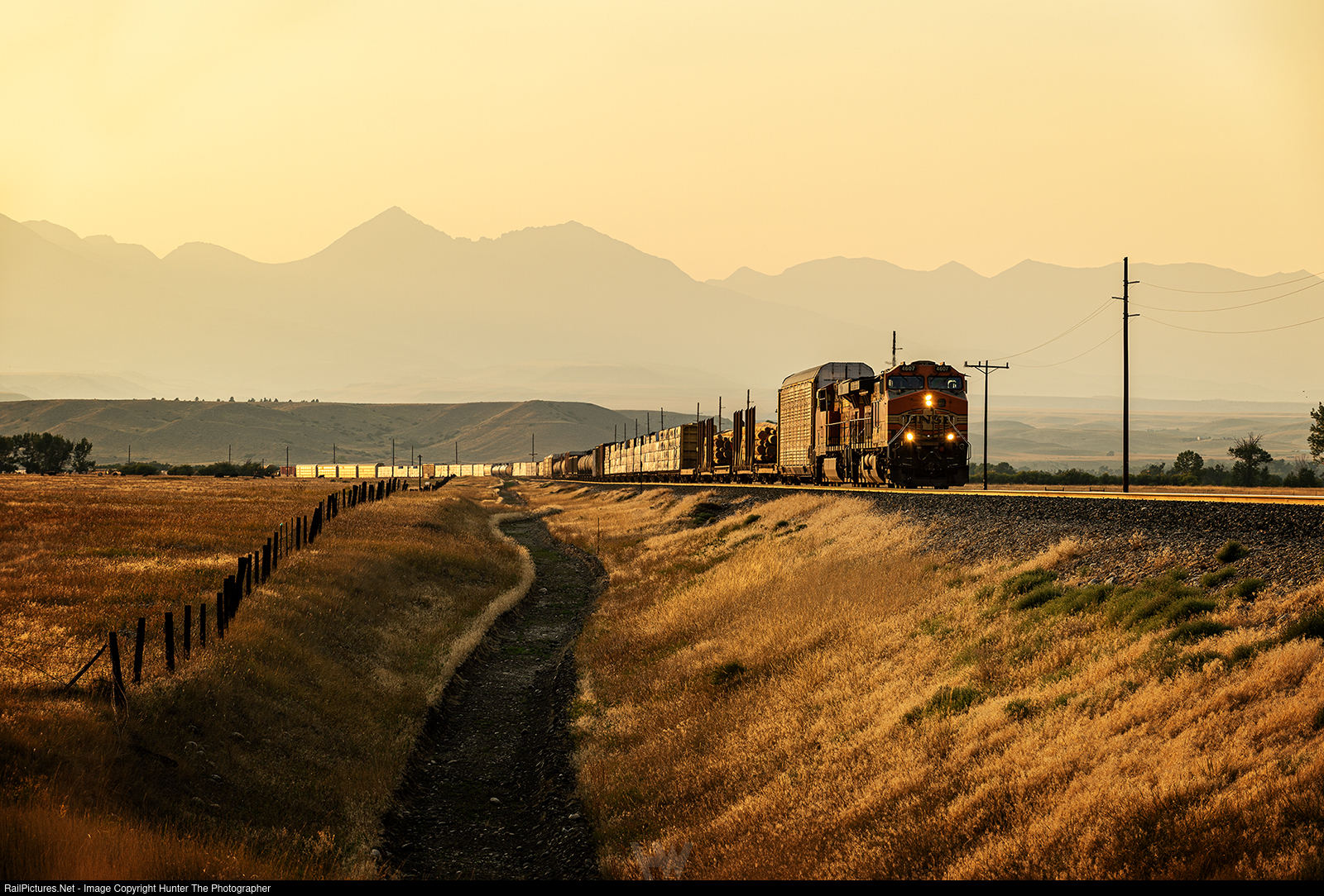 | As the sun approaches the horizon near Big Timber, MT on a warm Tuesday, September 2, 2025 evening, an eastbound BNSF manifest train stands out in front of the 11,214-foot tall Crazy Peak.