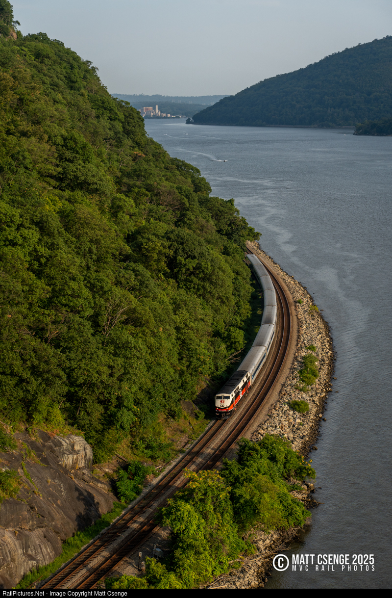 New Haven Through the Highlands. Metro-North Railroad P32AC-DM no. 228 is in charge of Hudson Line train 8845, seen here rounding Anthony's Nose and about to duck under the Bear Mountain Bridge.
