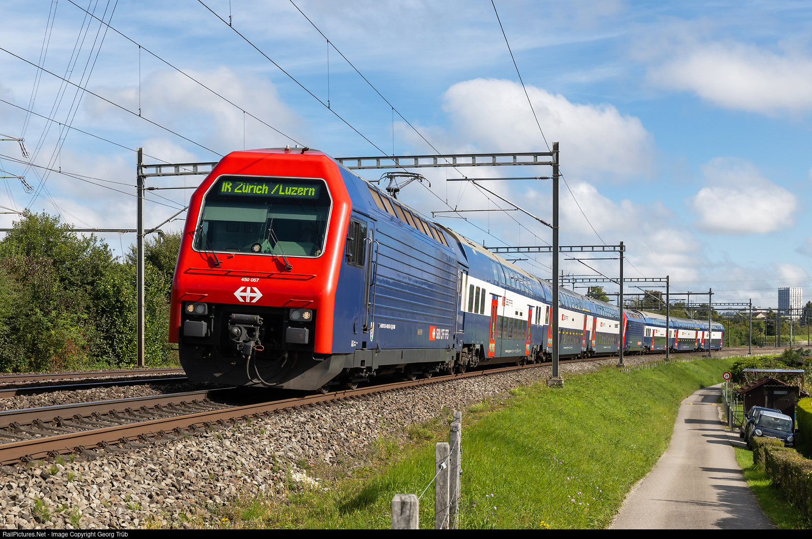 This is the IR 2114 of the line IR75 from Konstanz via Weinfelden-Winterthur-Zürich-Zug to Lucerne, between Winterthur and Winterthur Tössmühle. This day, the train is run by two doubledeck trains DPZ+ of the Zürich commuter network with locomotives Re 450 # 057 and # 114 in multiple control. Such deployments of S-Bahn rolling stock on this Interregio line occur repeatedly, especially on weekends, when events or changed timetables due to construction work create a greater need for Intercity rolling stock, which is normally used on the IR75.