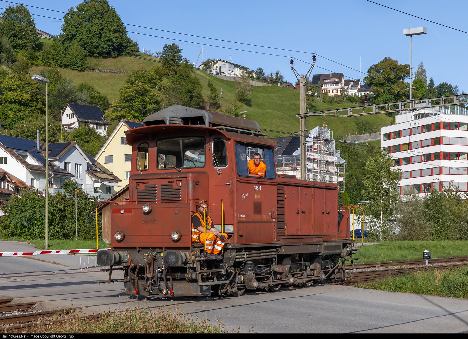 | The DVZO has taken over from the SBB the last operational diesel shunters Em 3/3 # 18815 and # 18824. Locomotive # 18815 with name "Sara" is in shunting service in Bauma, with head of project L.T. in the cab. |