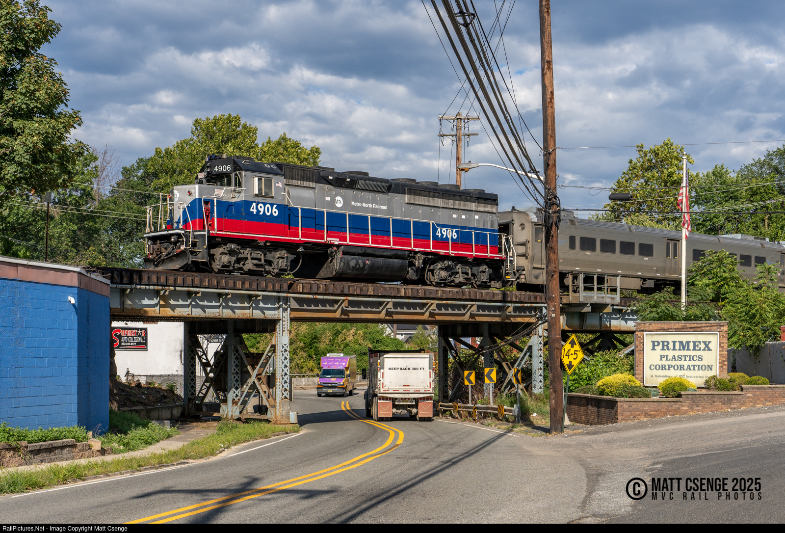 Metro-North Railroad GP40PH-2M no. 4906 is seen shoving NJ Transit train 66 over River Dr in Garfield, NJ as it races south towards Hoboken. The locomotive is one-of-a-kind on the Metro-North roster, working West-of-Hudson service alongside cowl unit geeps and F40s. |