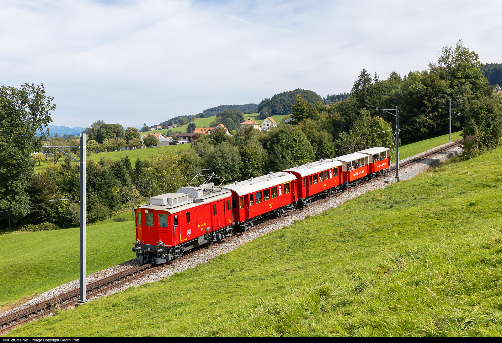 On this day, the 150th anniversary of the Rorschach-Heiden Mountain Railway (RHB) was celebrated. The standard-gauge railway with Riggenbach rack and pinion runs from Rorschach on the shores of Lake Constance up to the climatic health resort of Heiden in the canton of Appenzell Ausserrhoden. Additional special trains with older rolling stock were in service. The locomotive, or baggage car, DZeh 2/4 # 22, built in 1930 by SLM and MFO, takes train 35926 from Heiden down to Rorschach and Rorschach Hafen, between Heiden and the Schwendi stop. The closed cars AB # 13 and # 12 were also built in 1930 by SIG in Neuhausen. The two open “summer carriages” B # 6 and # 5 were built in 1875 and are used daily in good weather during the warmer months with the modern railcar. They are among the oldest vehicles in regular service in Switzerland.