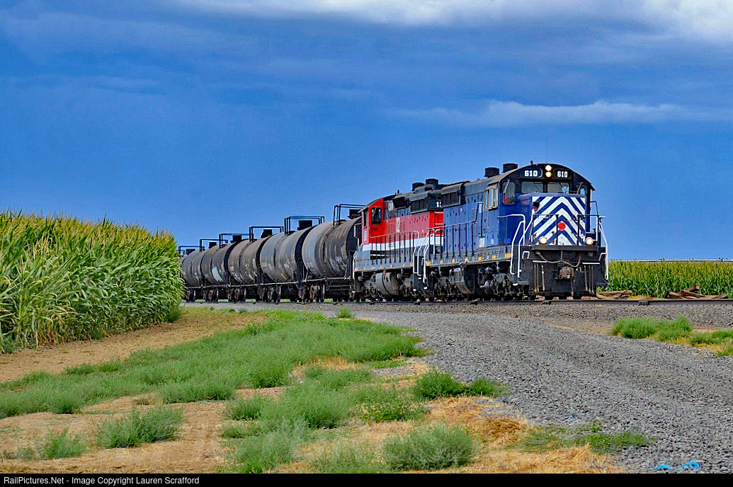 | "Field of Dreams". Columbia Basin 610 & 12 appear out of the cornfield at Schlomer, WA on August 7, 2025 with 17 cars for interchange with the BNSF at Connell, WA. It was a beautiful afternoon with clear blue skies until a dust storm hit the area followed by dark blue clouds and rain. |