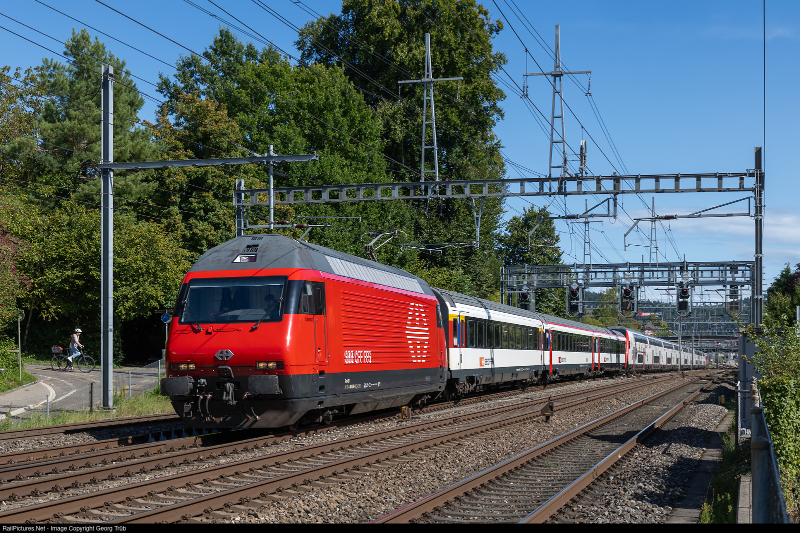 | IC 824 of the line IC8 from Romanshorn via Zürich-Bern to Brig, between Oberwinterthur and Winterthur. Re 460 # 088 is in front of 3 reinforcement cars of type EW IV, followed by the IC2000 psuh-pull train with Re 460 # 075 in the far rear. |