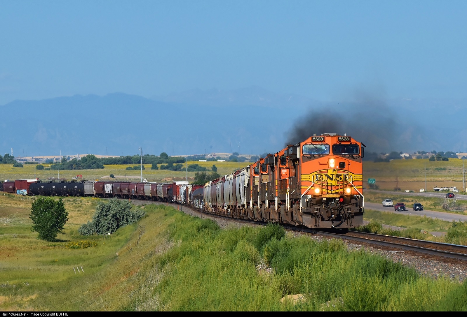 | BNSF 5628 (AC4400CW) with four other motors notch up as they climb the grade out of Hudson, Colorado on the Brush Sub.