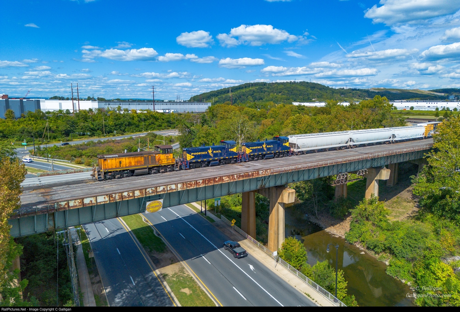 | Phoenix Rail recently took over LVRM in Bethlehem and Johnstown, PA. They've wasted no time repainting what motive power remains, leaving PB&NE 20 the only surviving engine in former Bethlehem colors as a trio of EMDs cross over the PB&NE bridge with cars from interchange with NS. |