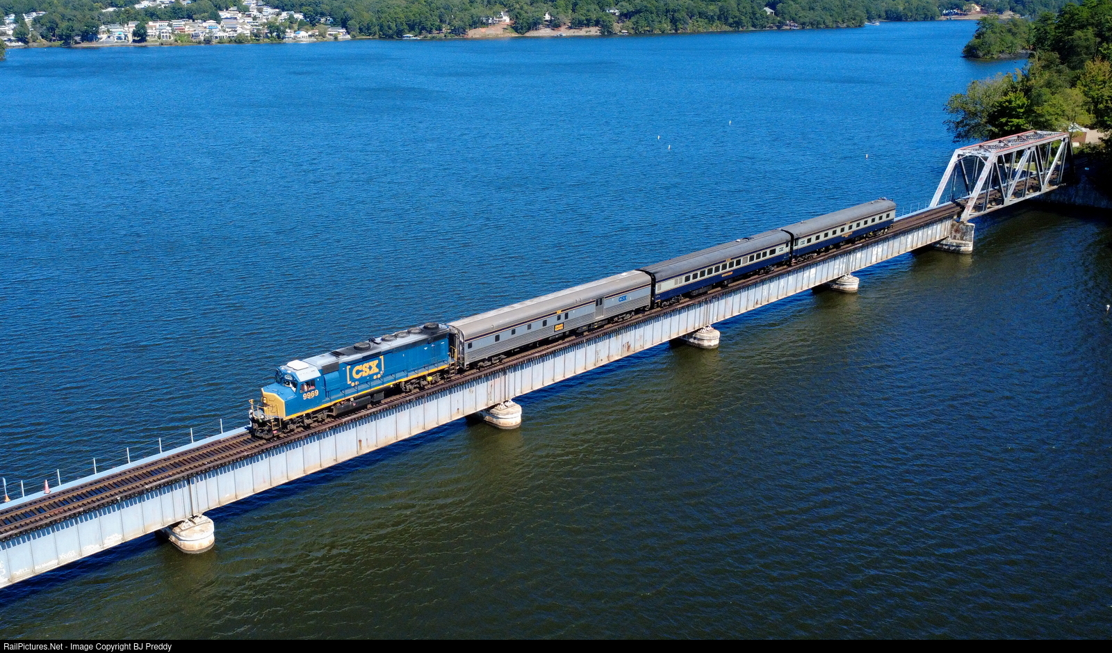 WSSB Z212 crosses over Badin Lake with the CSX track geometry train on its annual visit to Winston Salem Southbound and High Point, Thomasville, and Denton.