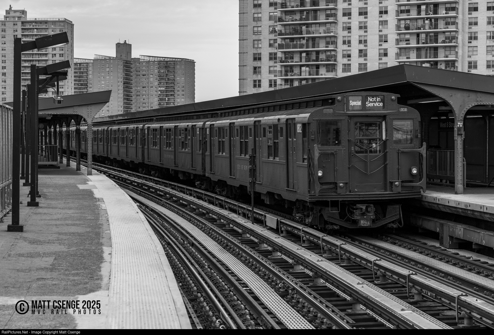 Out of Service Special. New York City Transit Authority (NYCTA) R9 "Arnine" no. 1802 brings up the rear of a NY Transit Museum equipment move passing through W 8th Street Station on the BMT Brighton Line, en route to Brighton Beach Station for the annual Parade of Trains event.