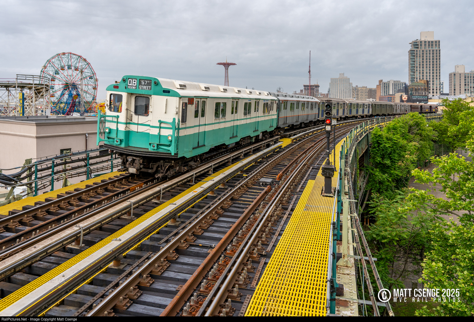 Mixed Metro. New York City Transit Authority (NYCTA) R10 car 3189 is the lead motor on a 9-car mixed train seen rounding the curve south of W 8th Street Station on the BMT Brighton Line. The reason for the mixed consist was that this was an equipment transfer in preparation for the NY Transit Museum's annual Parade of Trains event, and thus two trains worth of equipment was being moved from the yard. Included in the consist were: R10 no. 3189 (ACF, 1948-1949), R10 no. 3184 (ACF, 1948-1949), R32 no. 3360 (Budd, 1964-1965), R32 no. 3361 (Budd, 1964-1965), R16 no. 6387 (ACF, 1954-1955), R11/R34 no. 8013 (Budd, 1949), BU gate car 1404 (Jewett/Pressed Steel, 1907), BU gate car 1273 (Laconia/Pressed Steel, 1902), BU gate car 1407 (Jewett/Pressed Steel, 1907).