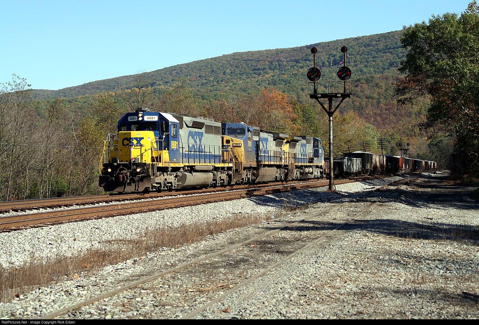 The stretch of railroad following the twisting Potomac river, deep in the Appalachian hills east of Cumberland, MD, was a haven for those appreciating the classic Baltimore & Ohio color position light signals. It's just after noon on a lovely autumn day as CSX 8881 grinds up the river valley with a westbound manifest.