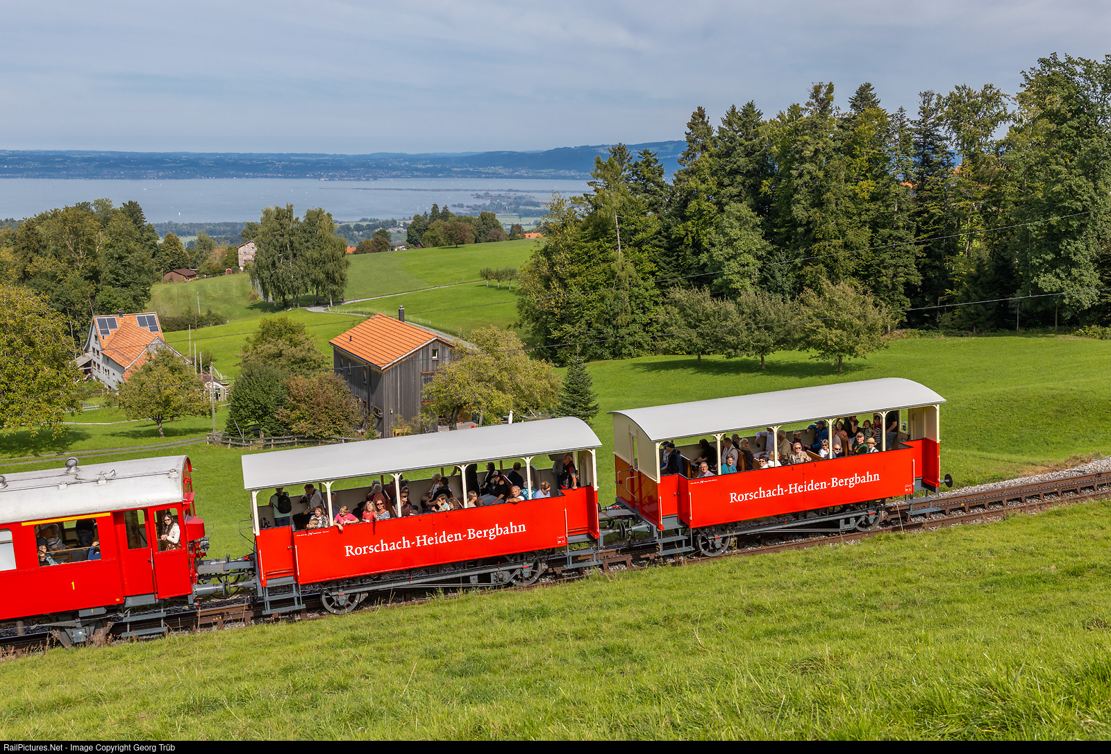 Passengers on the special train of the Rorschach-Heiden Mountain Railway (standard gauge cog railway) enjoy the ride in the open summer cars B # 6 and B # 5. The two carriages weigh only 7 tons when empty and were purchased in 1875 when the railway was built. 150 years later, they are still in daily use during the summer when the weather is good, running between Rorschach Harbor, Rorschach, and Heiden. The five summer carriages are the oldest railway vehicles in Switzerland still in regular service.