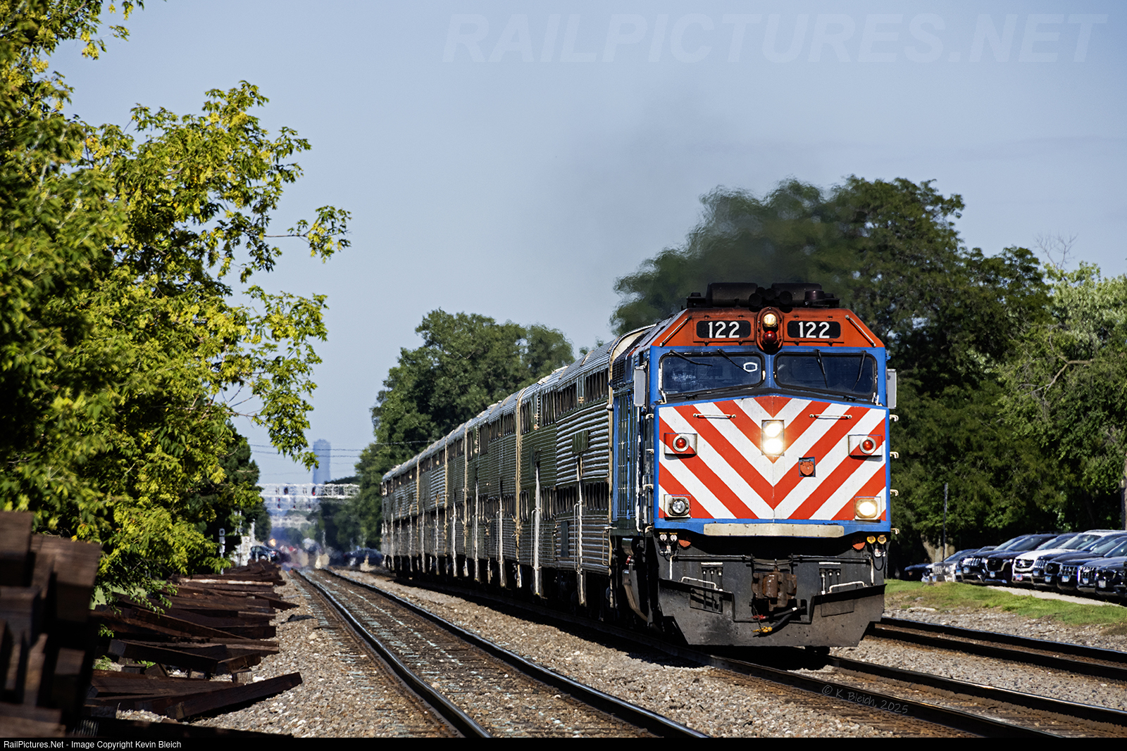 | Metra F40PH 122, still wearing the classic blue and red paint scheme, leads an afternoon outbound express train down main 2 of the BNSF Chicago Sub, better known as the Racetrack. |