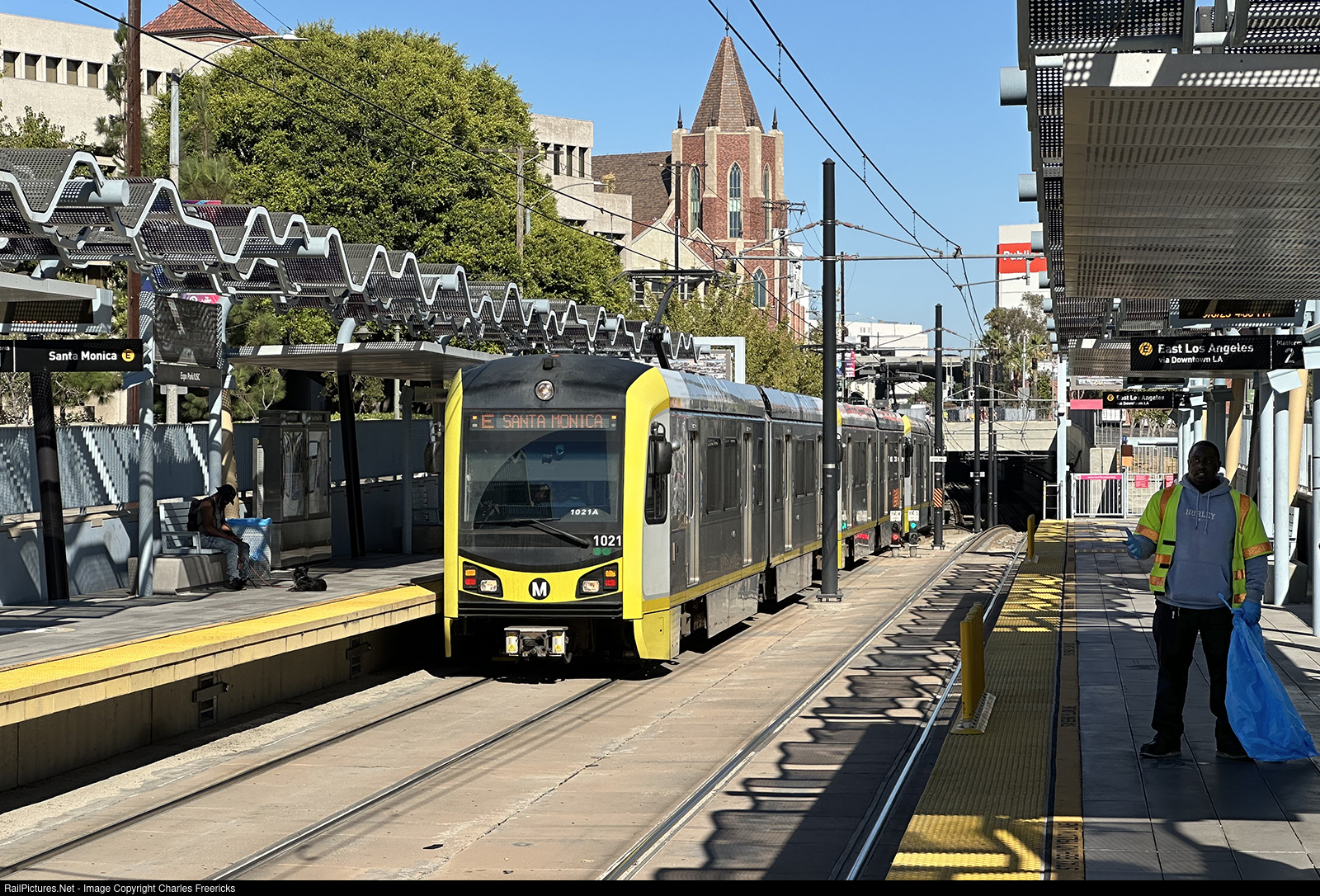 A Santa Monica bound Metro Rail trains pulls in for its station stop at Expo Park/USC on September 6, 2025. Rising above the train in the background, and looking like an historic church, is the new Gothic Revival Fertitta Hall. Los Angeles, California.