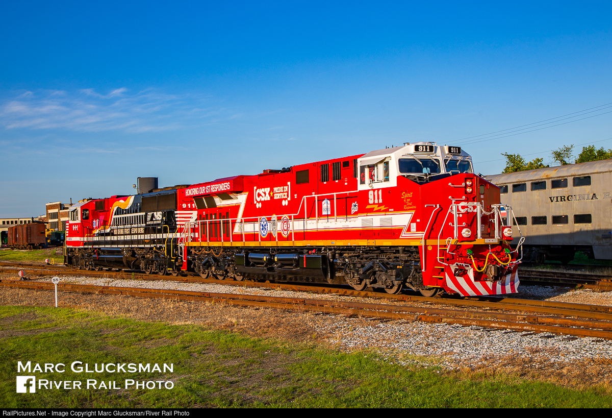 Joining 911s. CSXT 911 "Spirit Of Our First Responders" (ES44AH) and Norfolk Southern 911 "Honoring First Responders" (SD60E) were brought together on June 21, 2019 for the "Fire Truck Festival" at the N.C. Transportation Museum in Spencer, North Carolina. Both units honor First Responders, with logos for Police, Fire, and EMS workers. On the rear of the CSX unit is a graphic with the American Flag featuring the words "Never Forget" and a listing of the sites of the 9/11/01 attacks. This event was held shortly after the CSXT 911 was released by the railroad, and to date is the only time that both locomotives have been staged together.