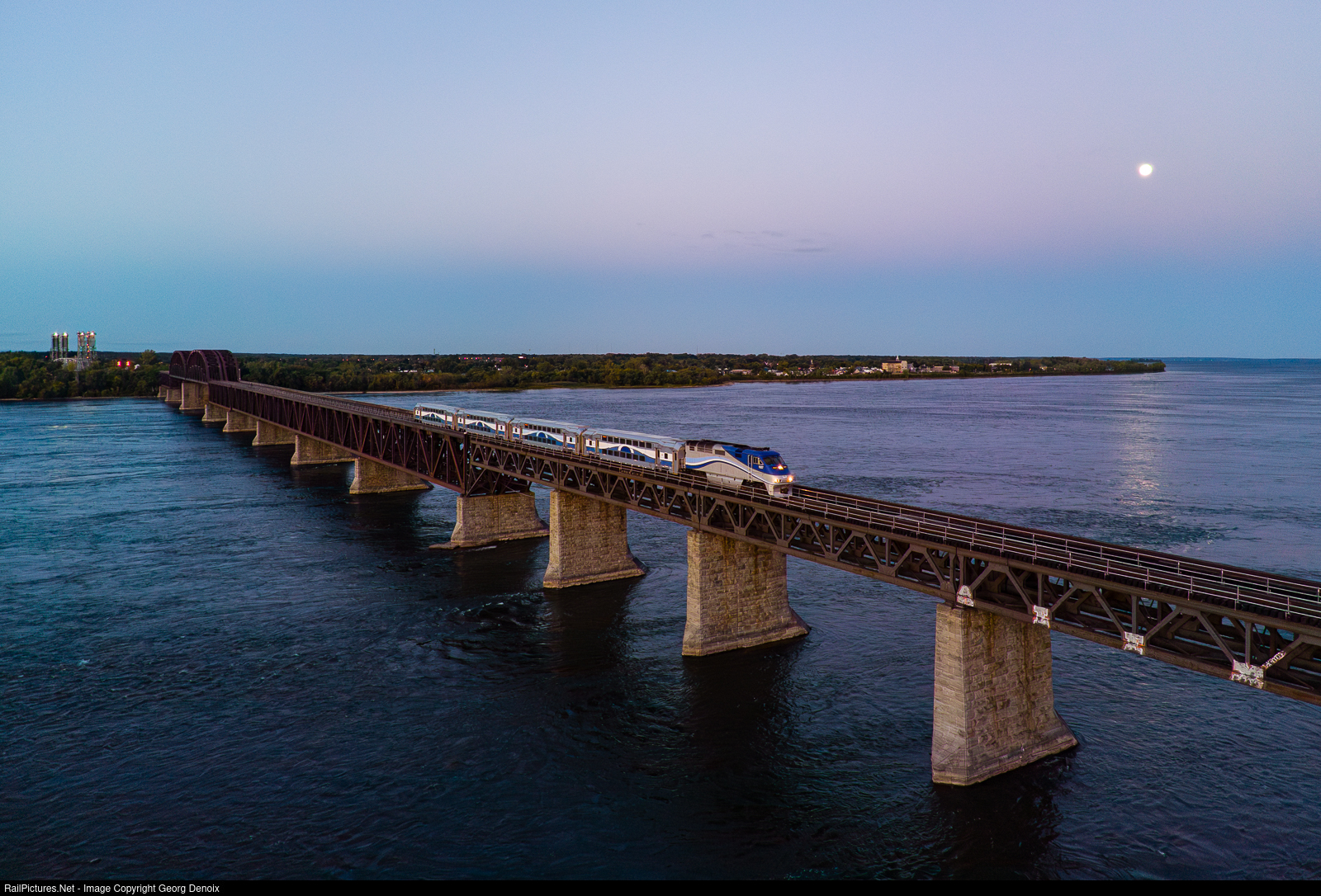 The sun is not quite up yet and the setting moon fits neatly in the frame as the first morning commuter service from Candiac rolls across the Saint Lawrence bridge at Lasalle, with the seaway lift bridge behind.