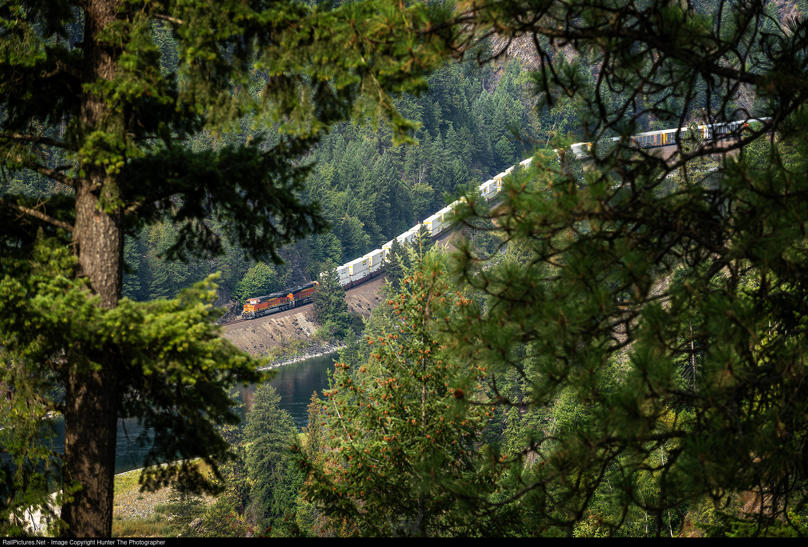 | Running along the south bank of the Kootenay River near Yakt, MT, an eastbound BNSF intermodal train makes its way into western Montana mid-morning on a warm Thursday, September 11, 2025.