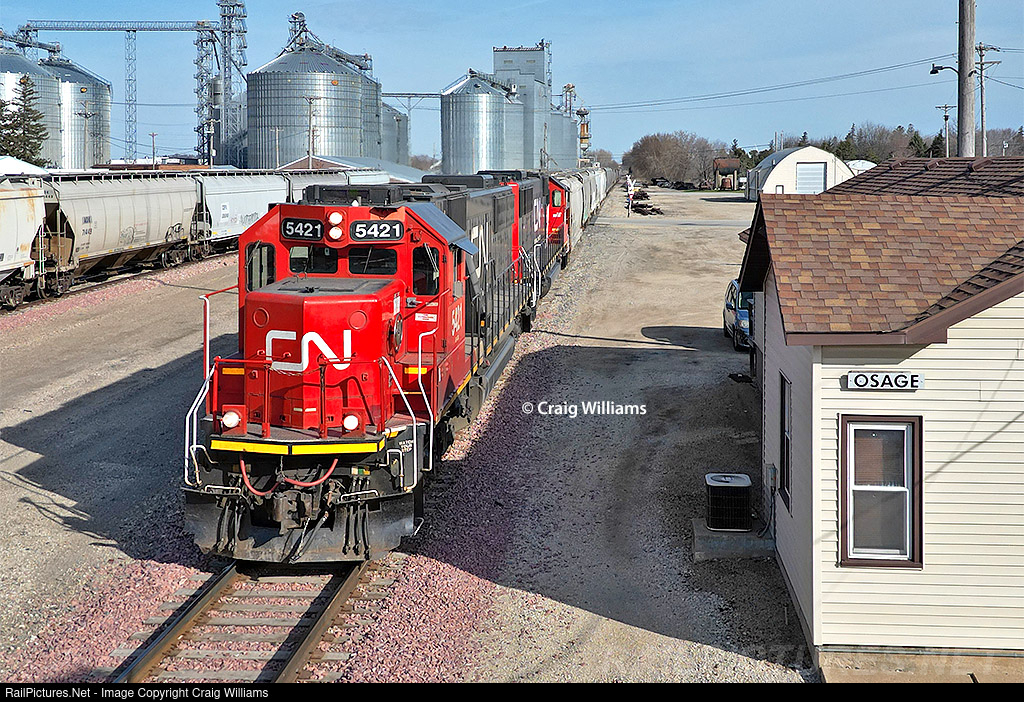 Home to the Cedar River, Osage has been the starting and stopping point of crews working the Osage Sub for many years. This year that changed when District 2 CN crews got qualified to run to Charles City for the new Valero ethanol plant business. I wouldn't be surprised if those crews get qualified to run to the Absolute Energy plant near Lyle, MN, later this year, too. CN picked up that new business in April. Grain is also moving now in bunches with the IANR sale; the Osage Sub is a happening place nowadays! Here the day crew rolls past the depot with mainly empties on the local bound for Waterloo.