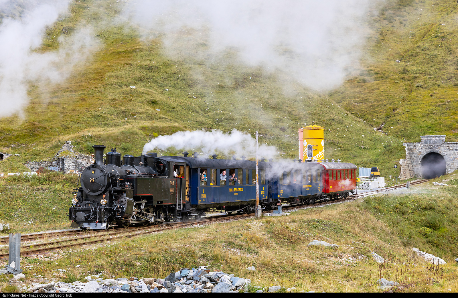 | HG 3/4 # 4 of the Dampfbahn Furka Bergstrecke (DFB) is leaving the Furka summit tunnel and entering Muttbach-Belvédère station with train 157 Realp-Oberwald for the crossing with the passenger extra with HG 4/4 # 708. |