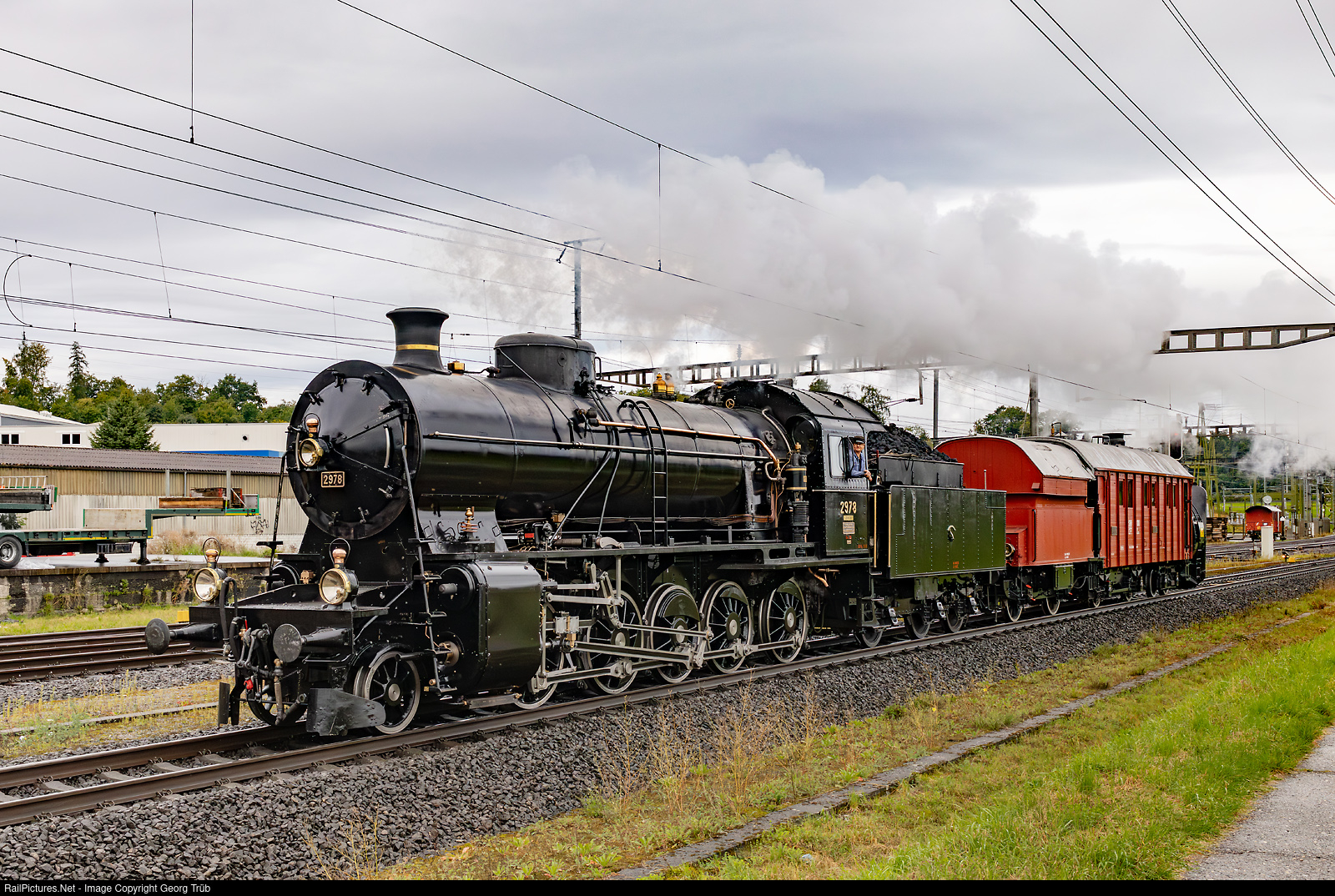 | 2-10-0 fourcylinder compound freight train steamlocomotive C 5/6 # 2978 of SBB Historic is running through Hendschiken as train 39961 from Brugg via Rotkreuz to Arth Goldau (-Erstfeld) with the steam rotary snow blower Xrot # 100 under pressure. |