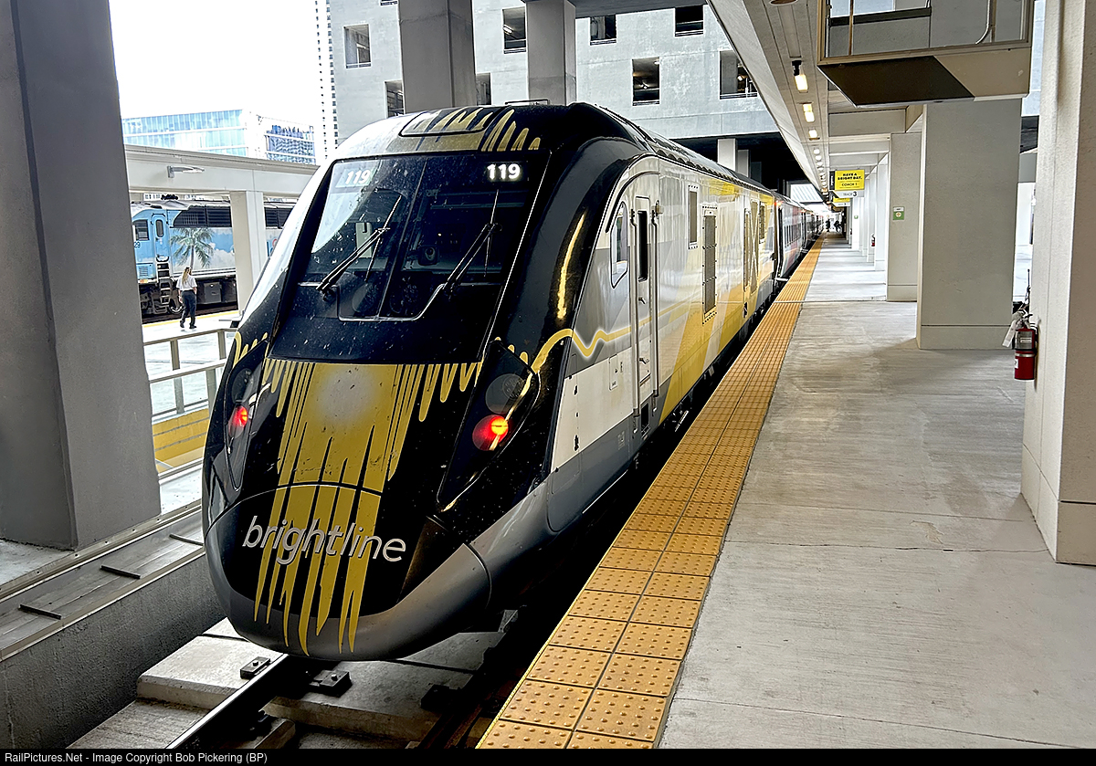 | The 732 has arrived in Miami at Miami Central. This railway station not only features Brightline but also Tri Rail which can be seen in the distance. |
