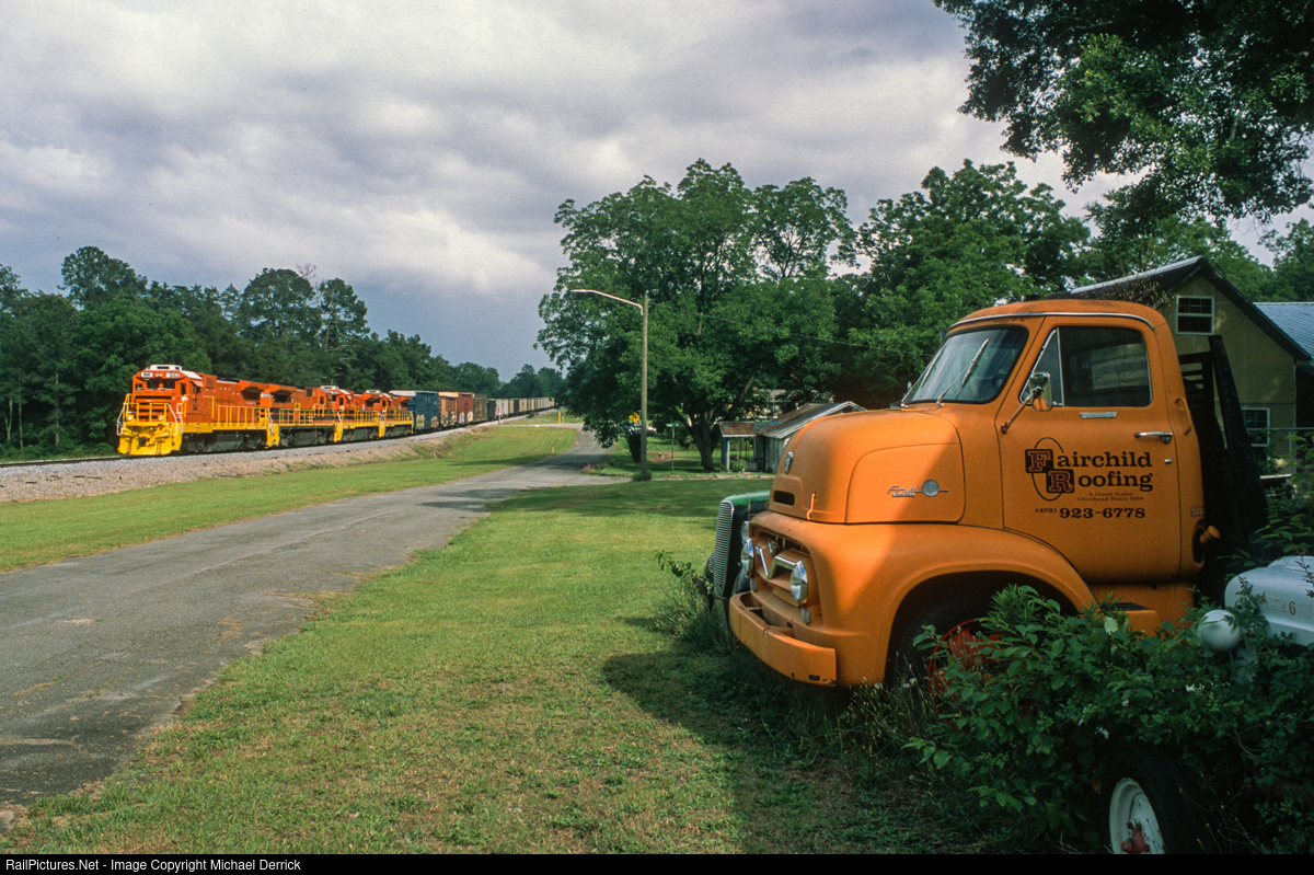 Georgia Central L782 westbound through the small town of Danville, GA on its way to Macon, GA. GC 543 was one of two locomotives yet to receive Genesee & Wyoming colors and had recently been repainted into the company's 125th anniversary retro scheme. The other unit, GC 533, received the Veterans tribute camouflage scheme. With the repainting of those units all of the B32-8s on the Georgia Central now wear some iteration of the G&W paint scheme.