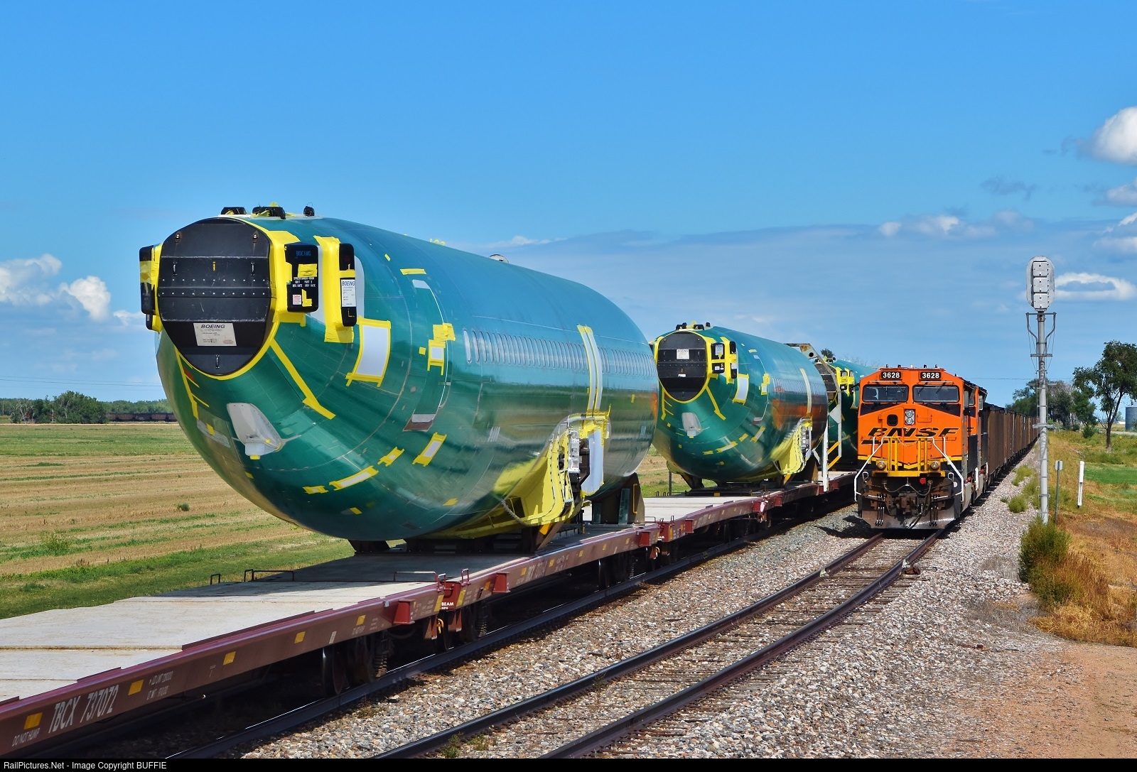 Boeing 737 fuselages pass BNSF 3628 (ET44ACH) as it holds a coal train on the siding at Hillrose, Colorado.