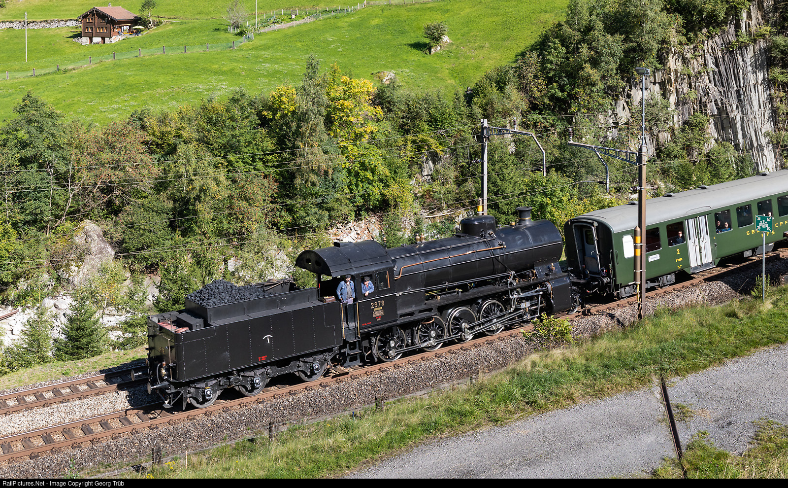 | On the occasion of the Gotthard Railway Days 2025, the "Elephant" C 5/6 # 2978 of SBB Historic pulls tender first train 31718 from Göschenen down to Erstfeld through the Wattinger curve between Waasen and Gurtnellen. In the rear of the train was Re 620 # 066 for electric brake power. |